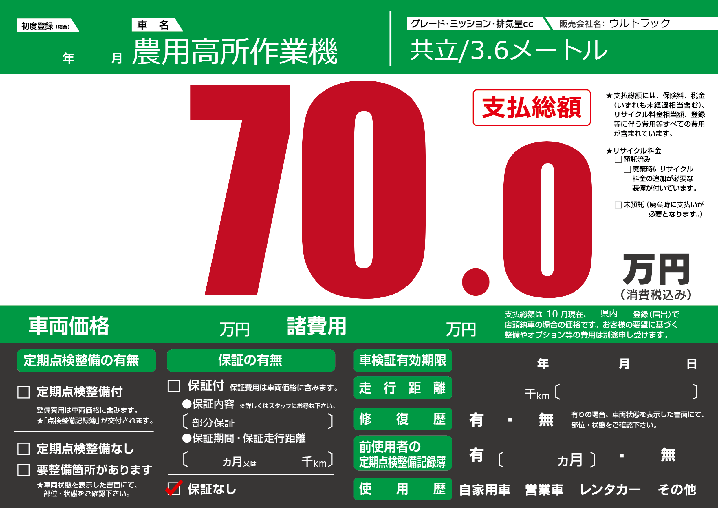 | 車名 | 農用高所作業機 | グレード ミッション 排気量 |