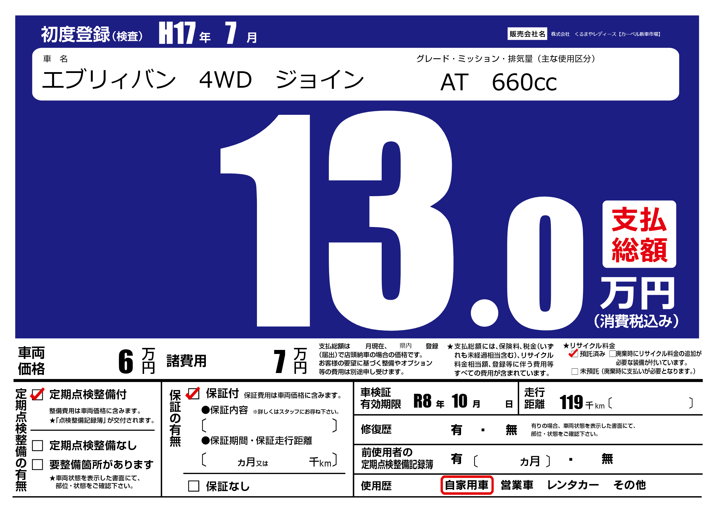 | 走行キロ | 11.9万km | 初年度登録 | H17年7月 |