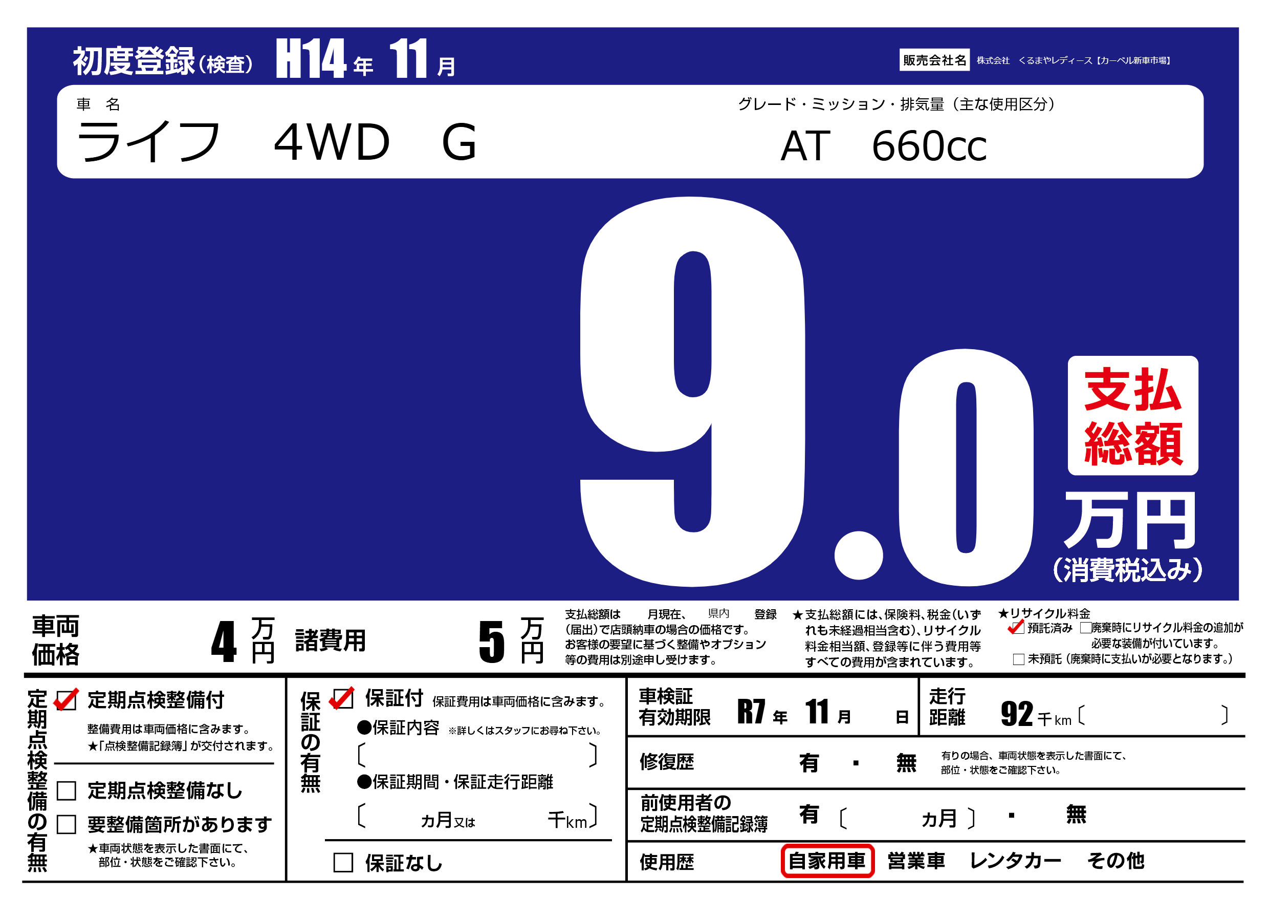 | 車名 | ライフ 4WD G | グレード ミッション 排気量 |