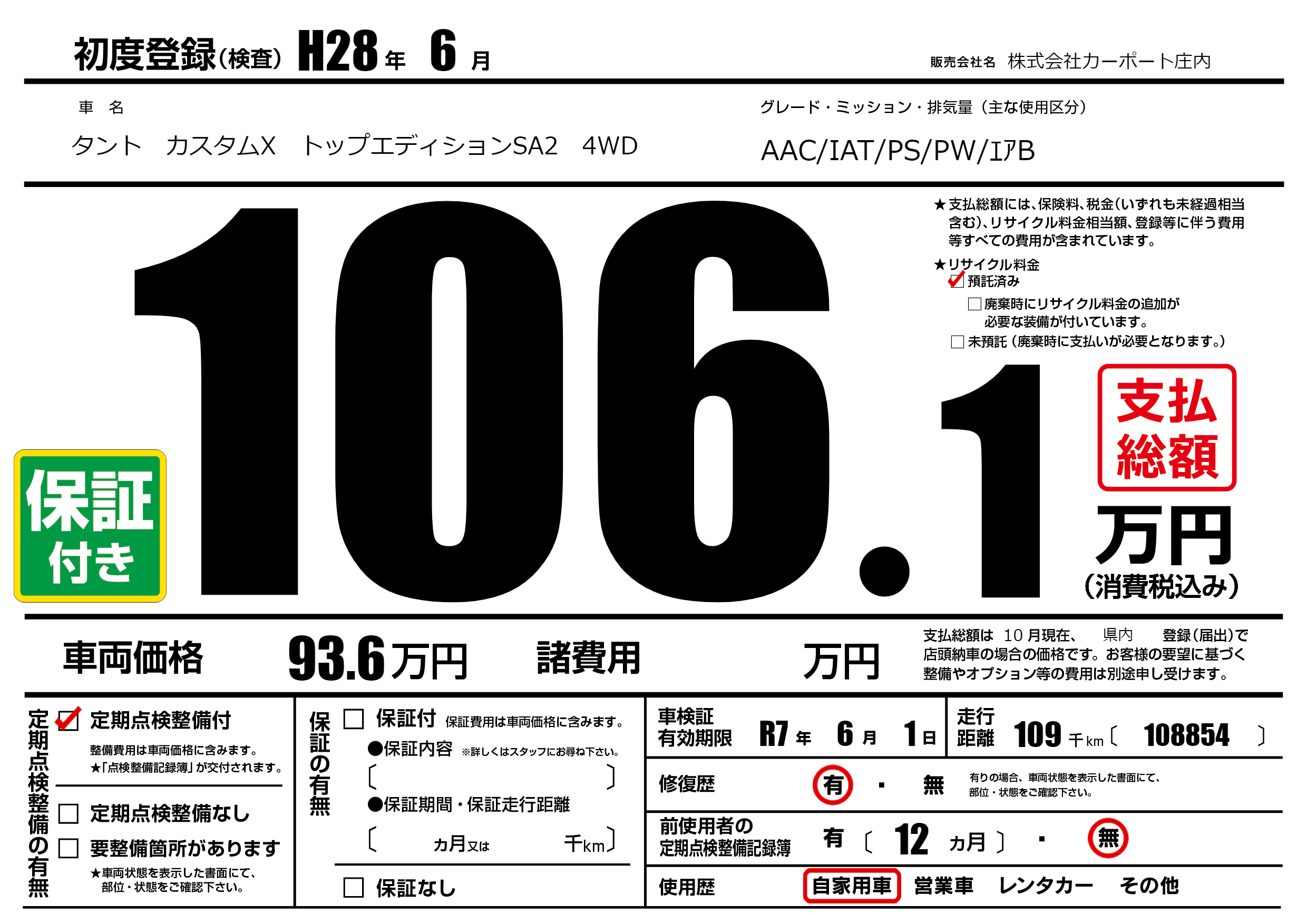 | 車名 | タント カスタムX トップエディションSA2 4WD | グレード ミッション 排気量 |