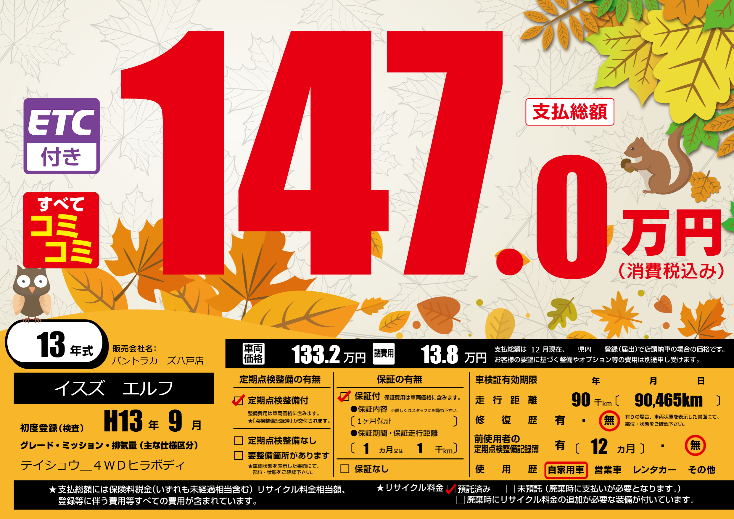 | 走行キロ | 9万km | 初年度登録 | H13年9月 |