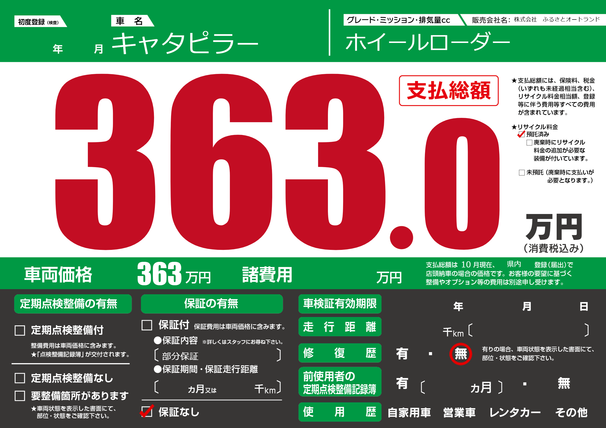 保証なし 保証内容(部分保証) ---ヶ月または()千kmまで |
