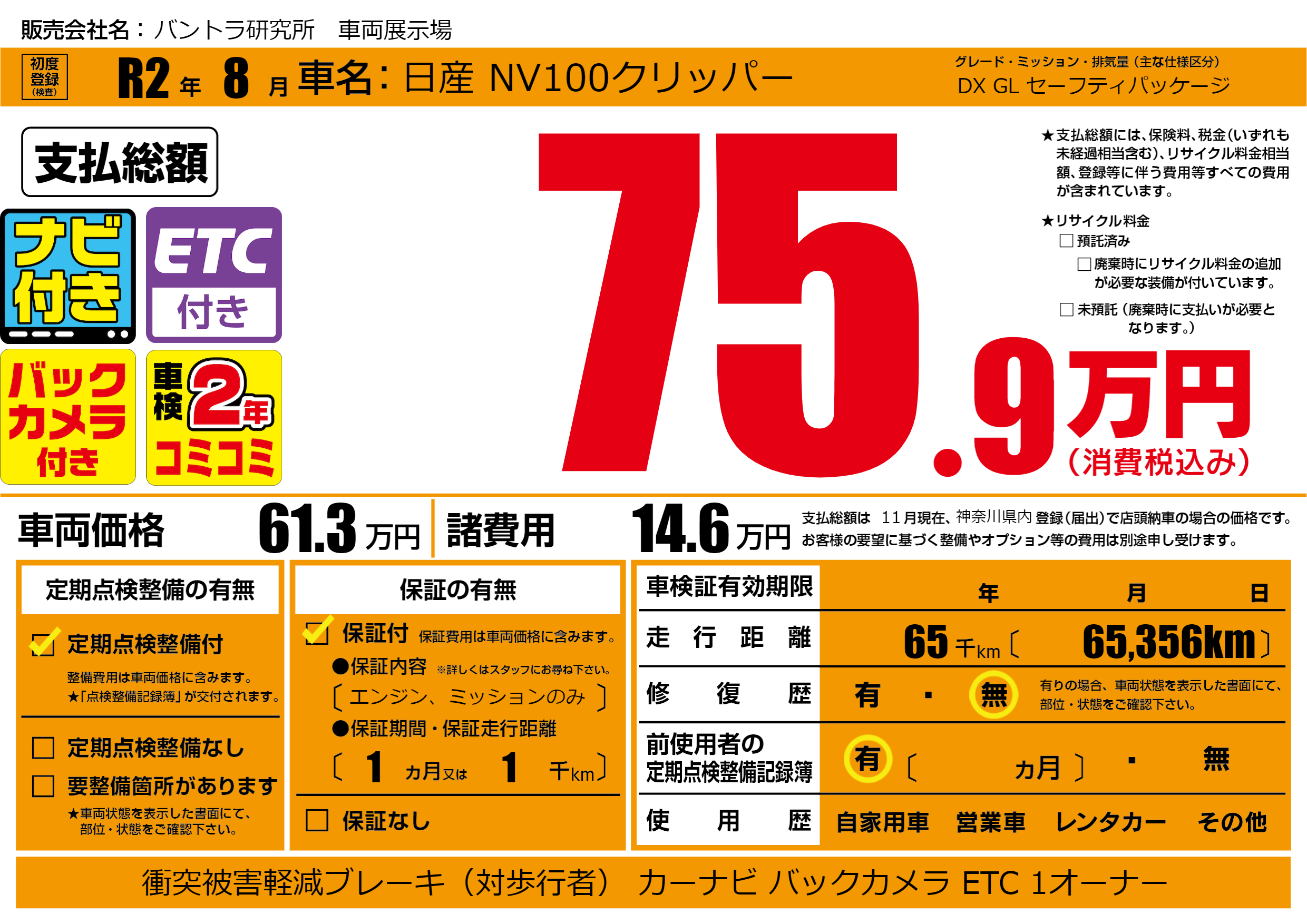| 車名 | 日産 NV100クリッパー | グレード ミッション 排気量 |