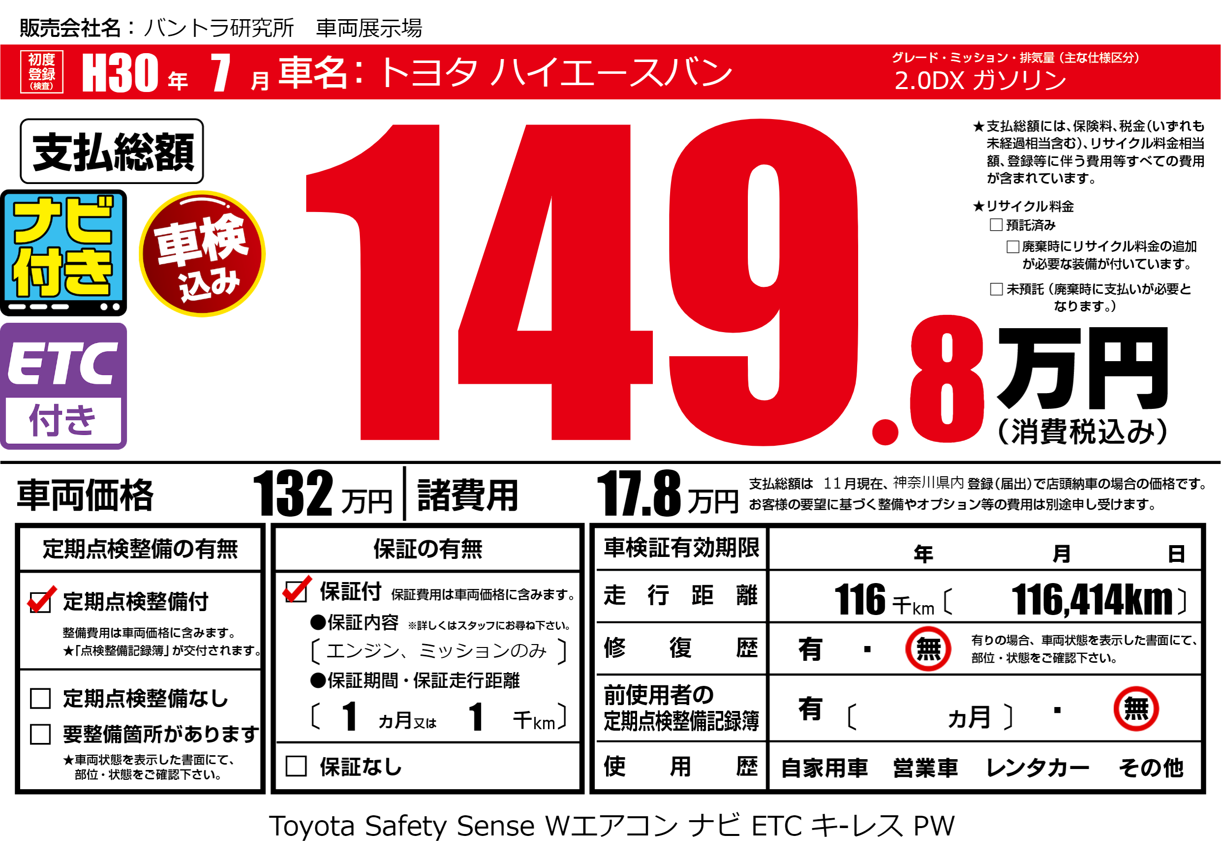 | 走行キロ | 11.6万km | 初年度登録 | H30年7月 |