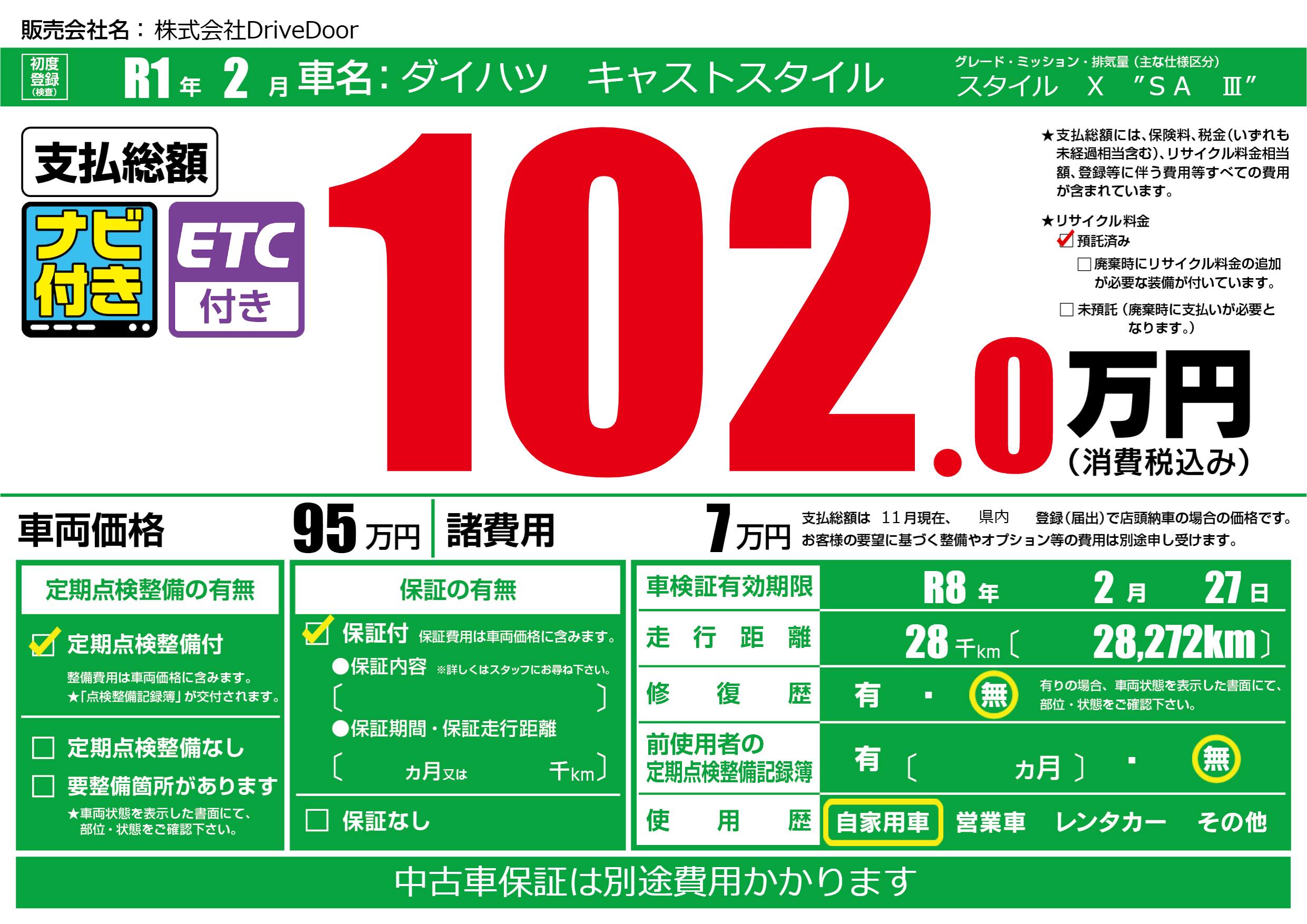 | 車名 | ダイハツ キャストスタイル | グレード ミッション 排気量 |