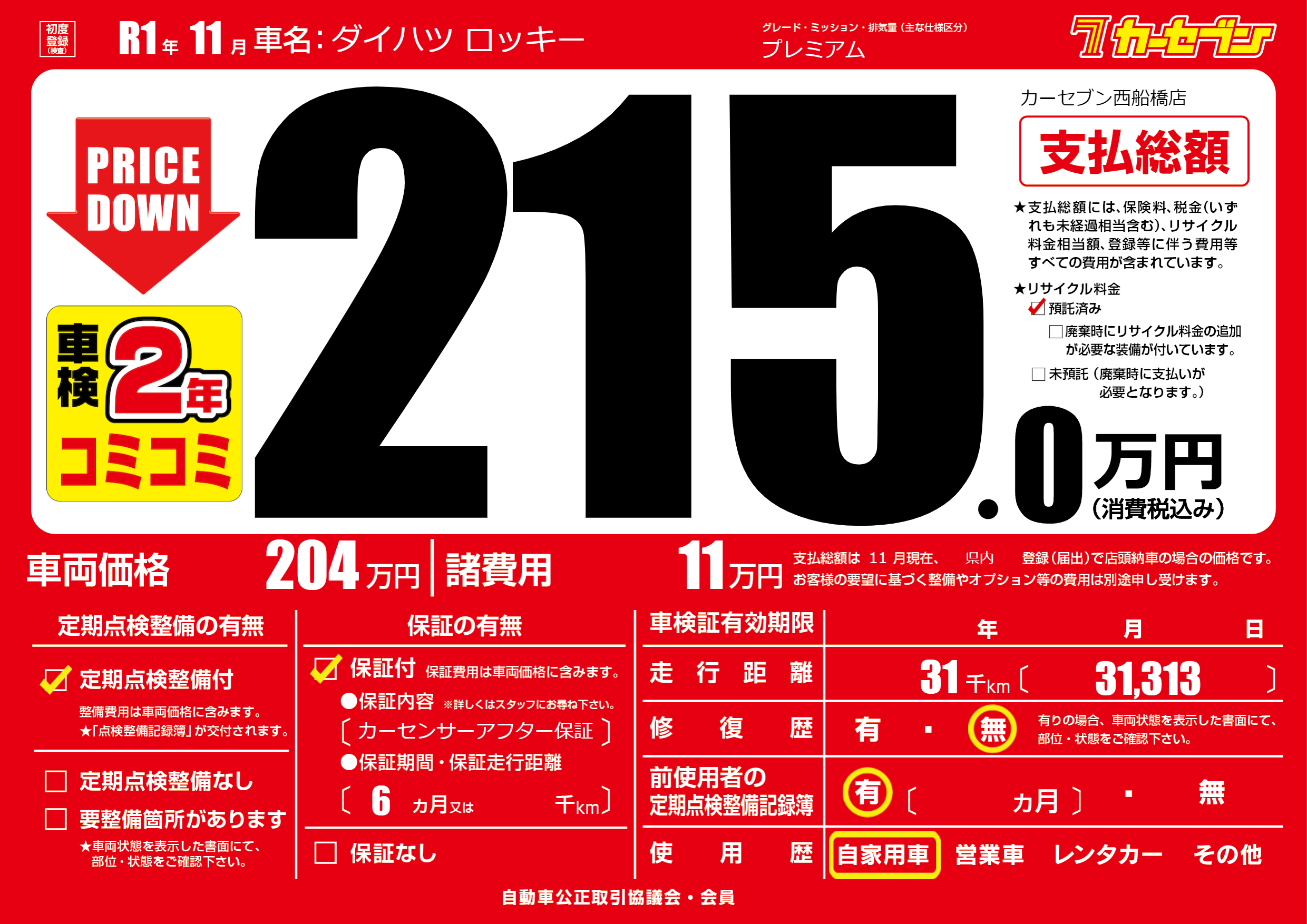 | 走行キロ | 3.1万km | 初年度登録 | R1年11月 |