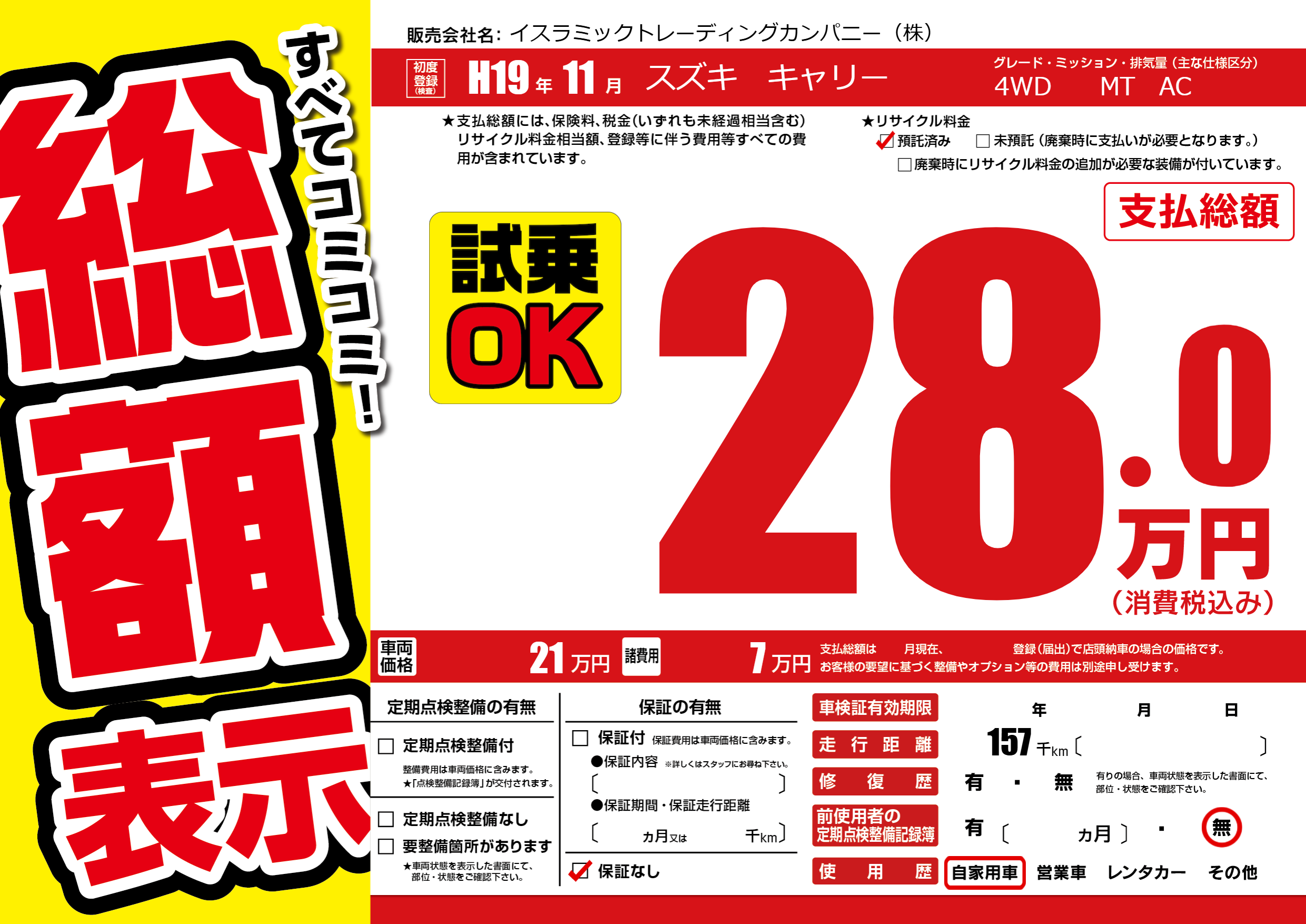 | 走行キロ | 15.7万km | 初年度登録 | H19年11月 |