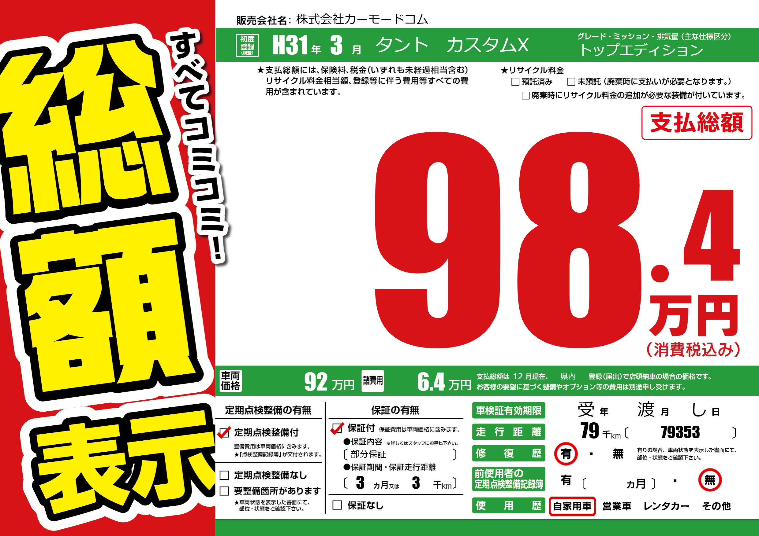 | 車名 | タント カスタムX | グレード ミッション 排気量 |