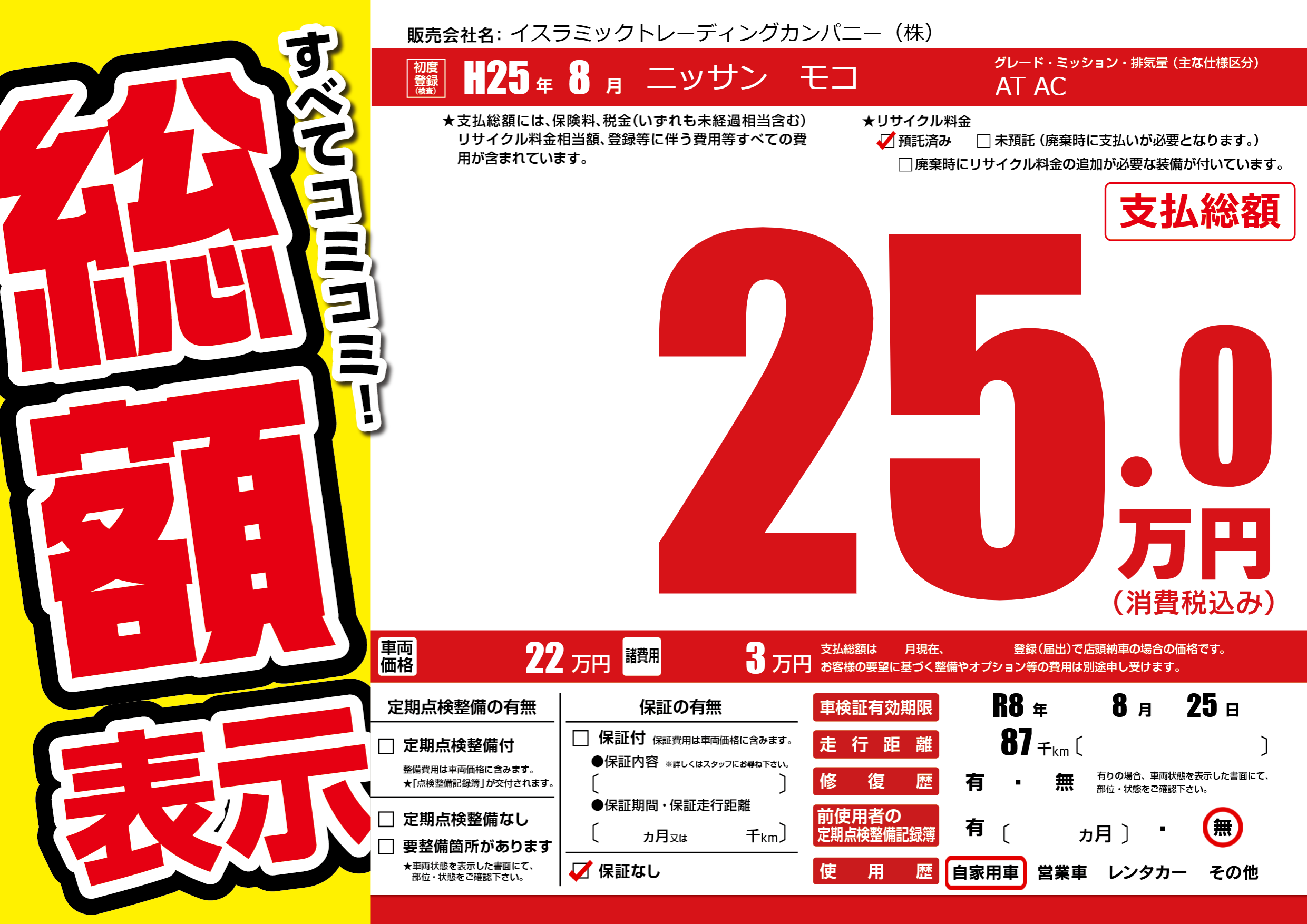 | 走行キロ | 8.7万km | 初年度登録 | H25年8月 |