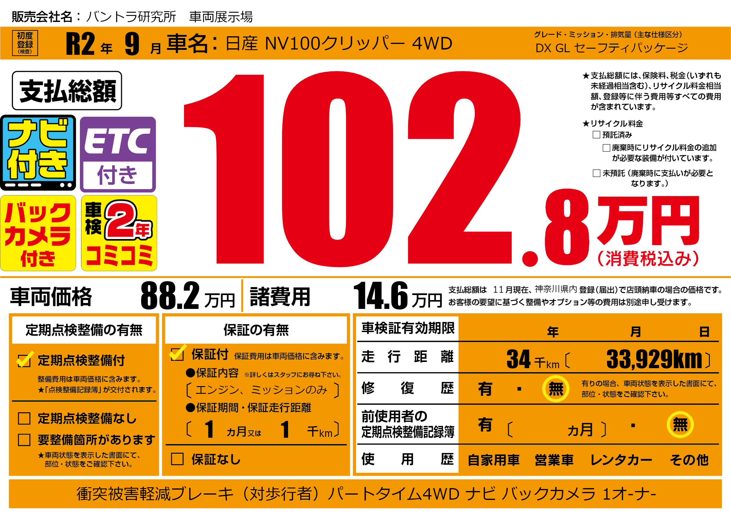 | 車名 | 日産 NV100クリッパー 4WD | グレード ミッション 排気量 |