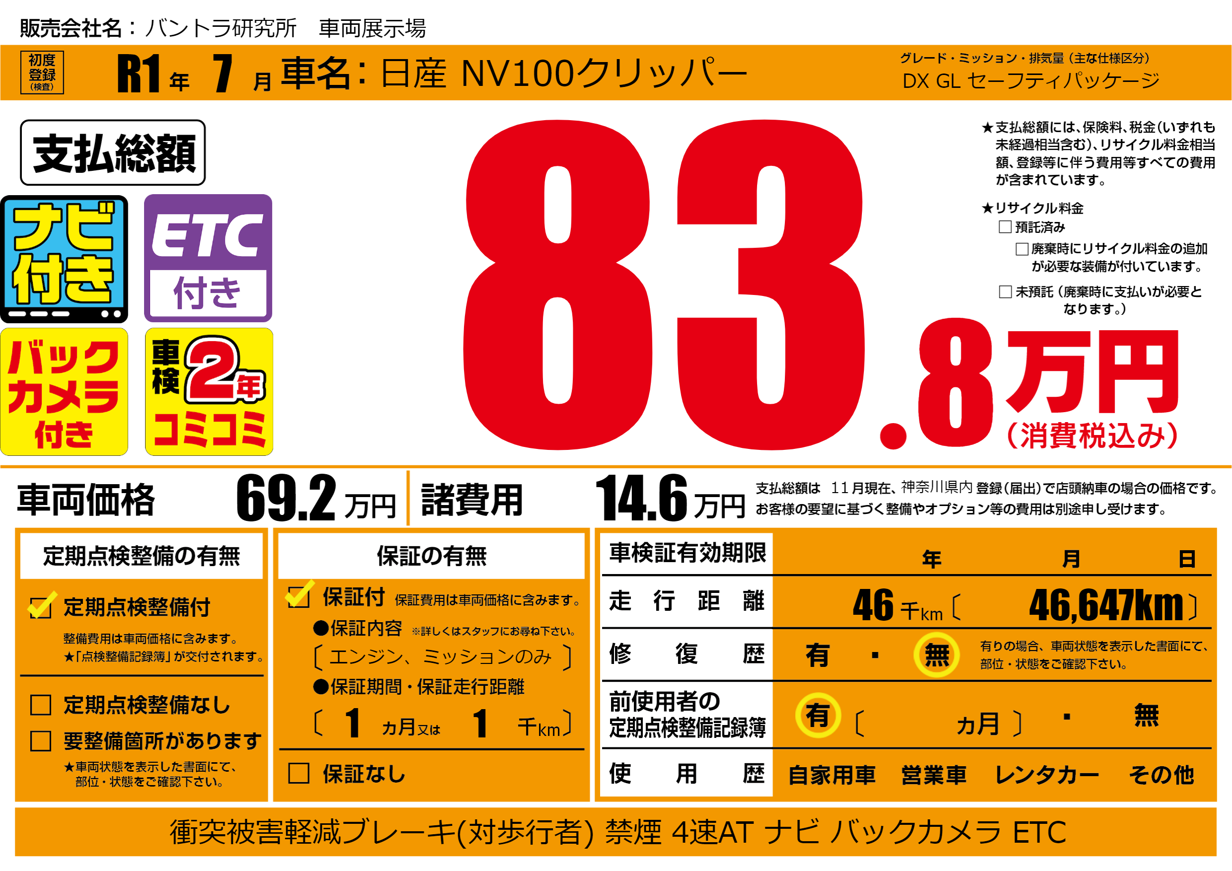 | 車名 | 日産 NV100クリッパー | グレード ミッション 排気量 |