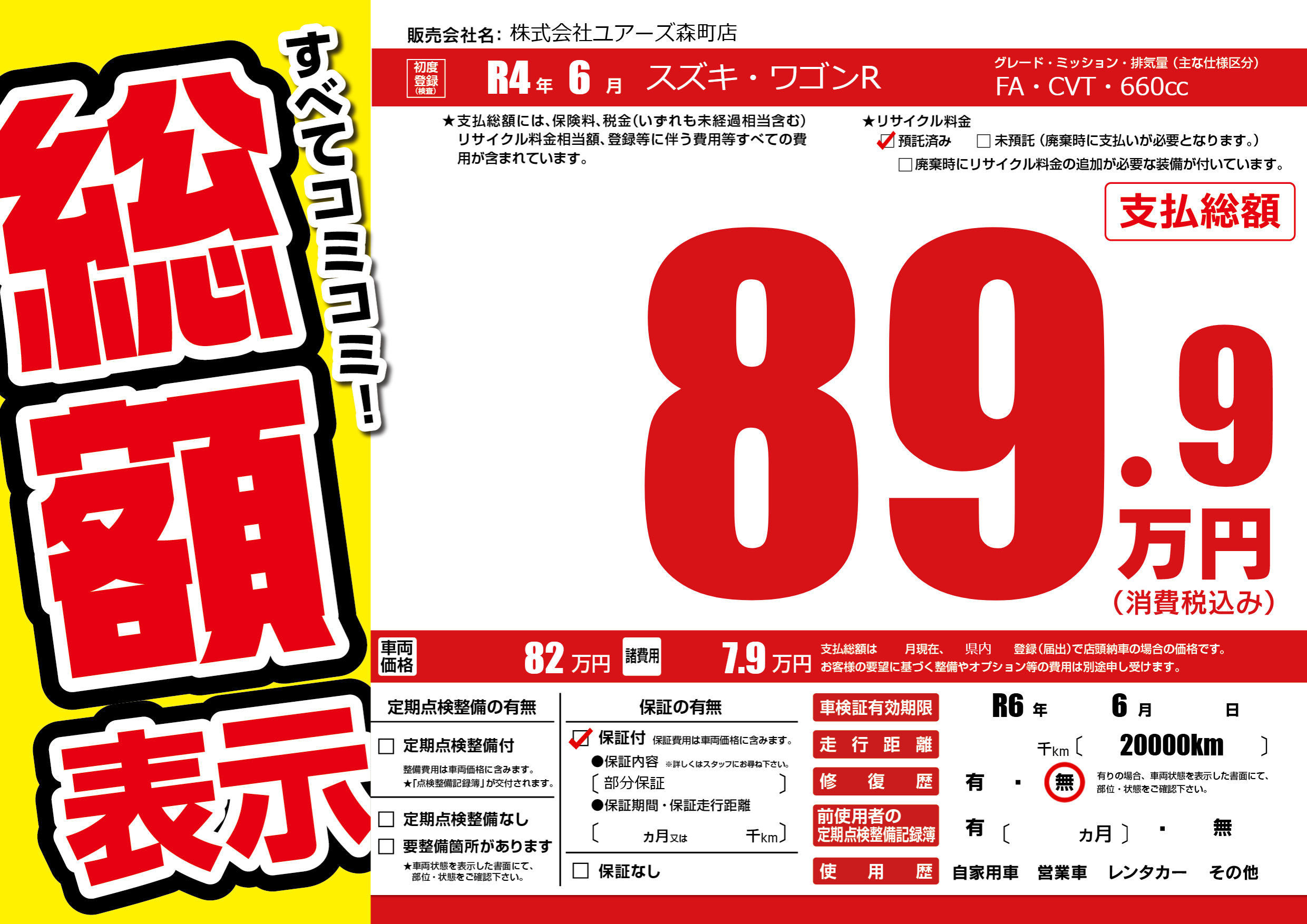 | 車名 | スズキ・ワゴンR | グレード ミッション 排気量 |