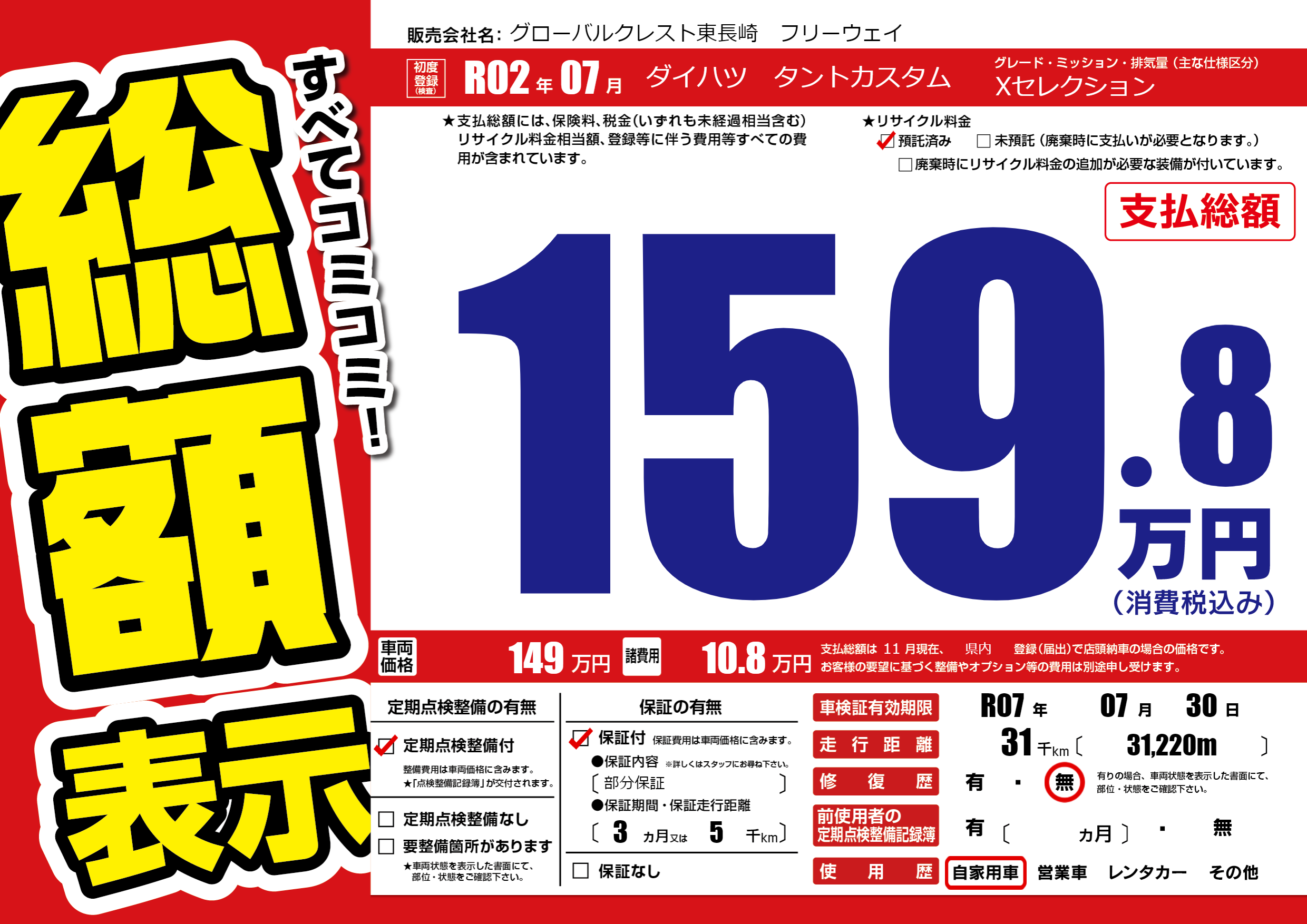 | 車名 | ダイハツ タントカスタム | グレード ミッション 排気量 |