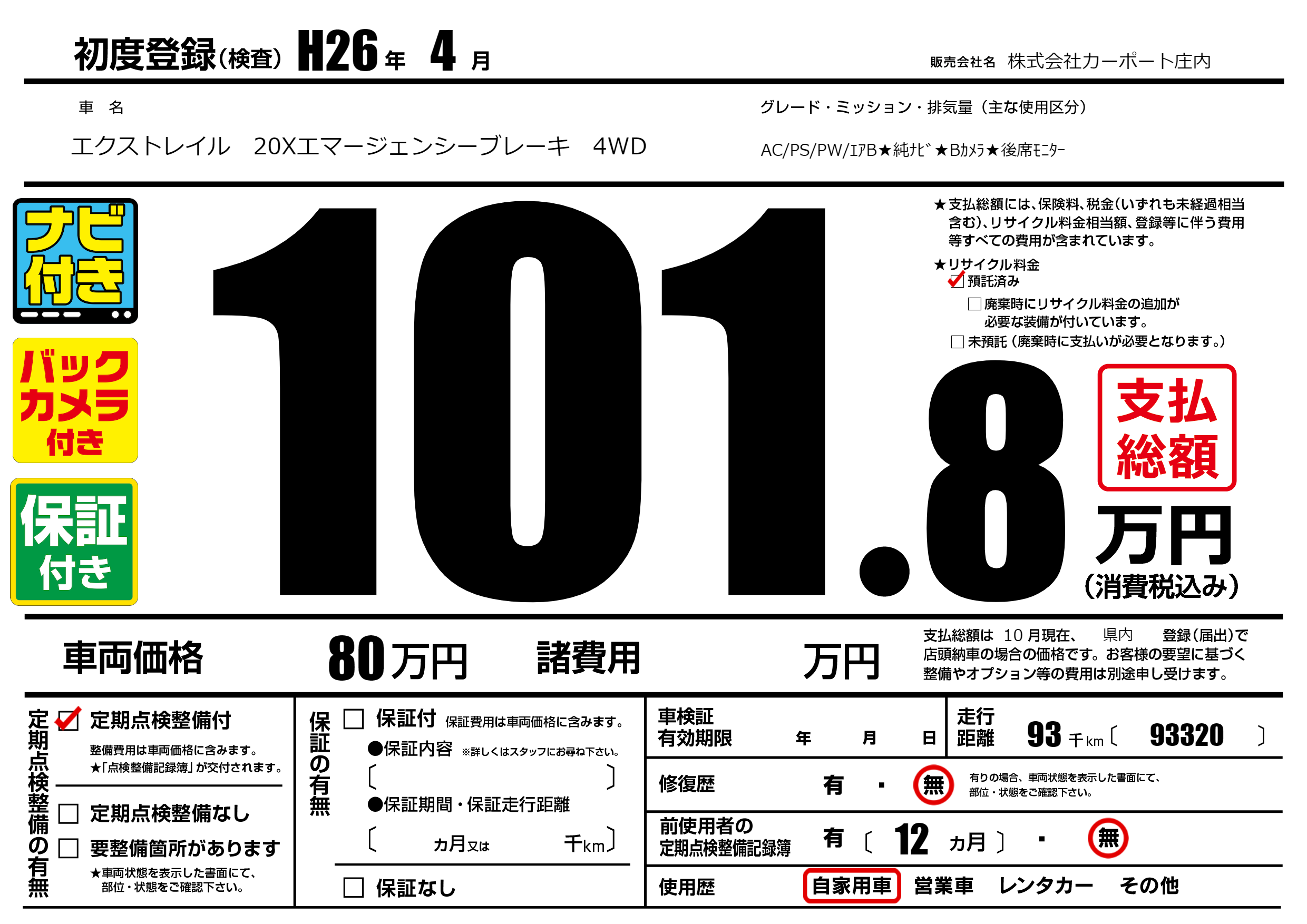 | 走行キロ | 9.3万km | 初年度登録 | H26年4月 |