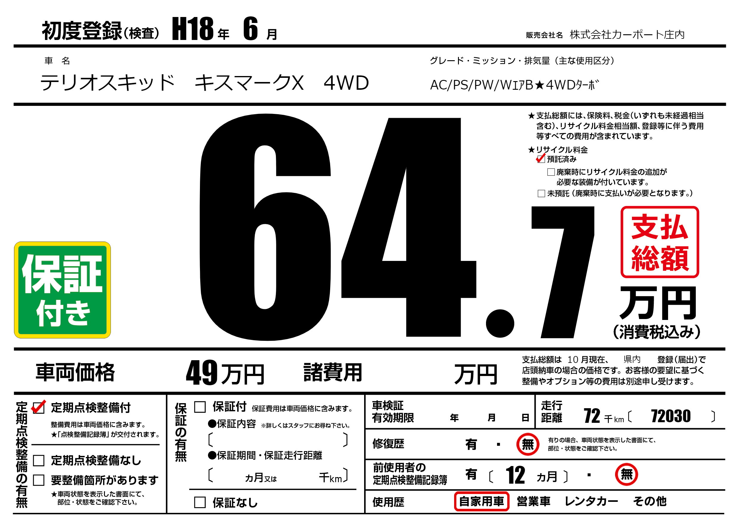 | 車名 | テリオスキッド キスマークX 4WD | グレード ミッション 排気量 |