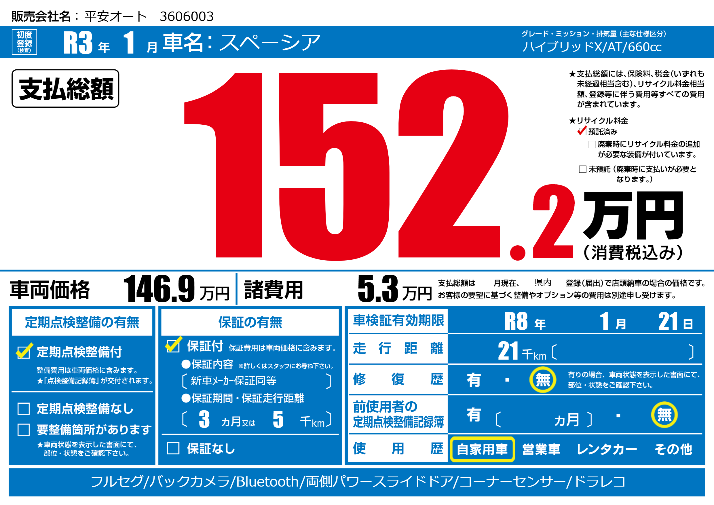 保証付き 保証内容(新車メーカー保証同等) 3ヶ月または(5)千kmまで |