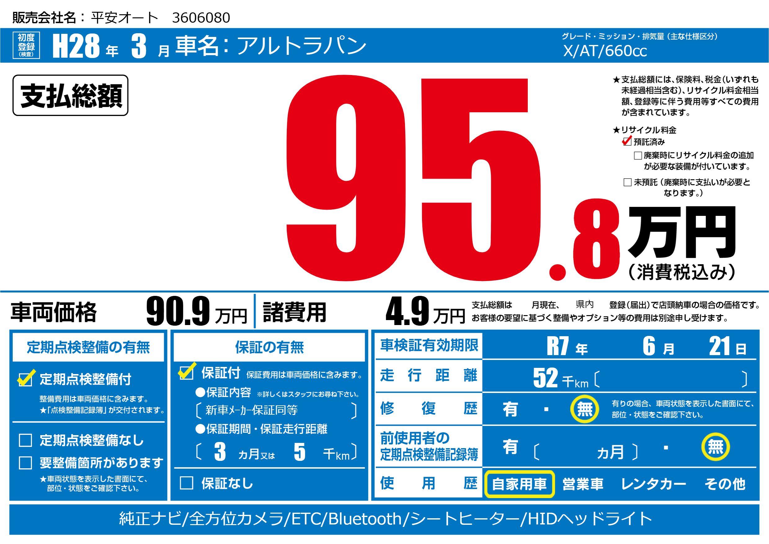 保証付き 保証内容(新車メーカー保証同等) 3ヶ月または(5)千kmまで |