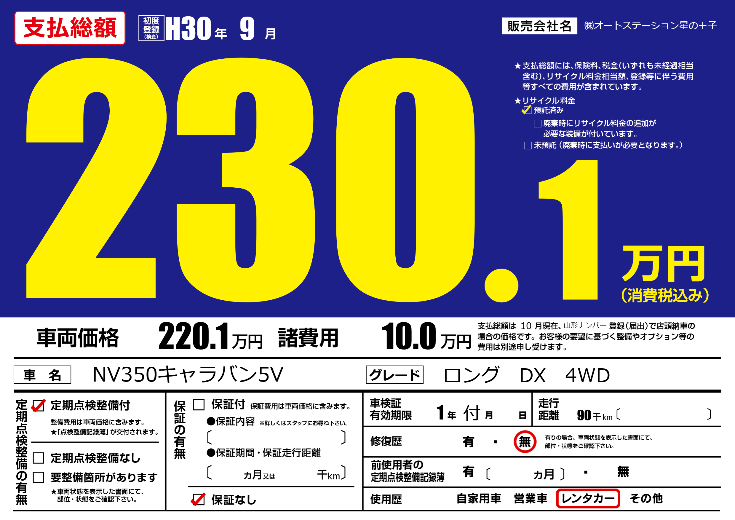 | 走行キロ | 9万km | 初年度登録 | H30年9月 |