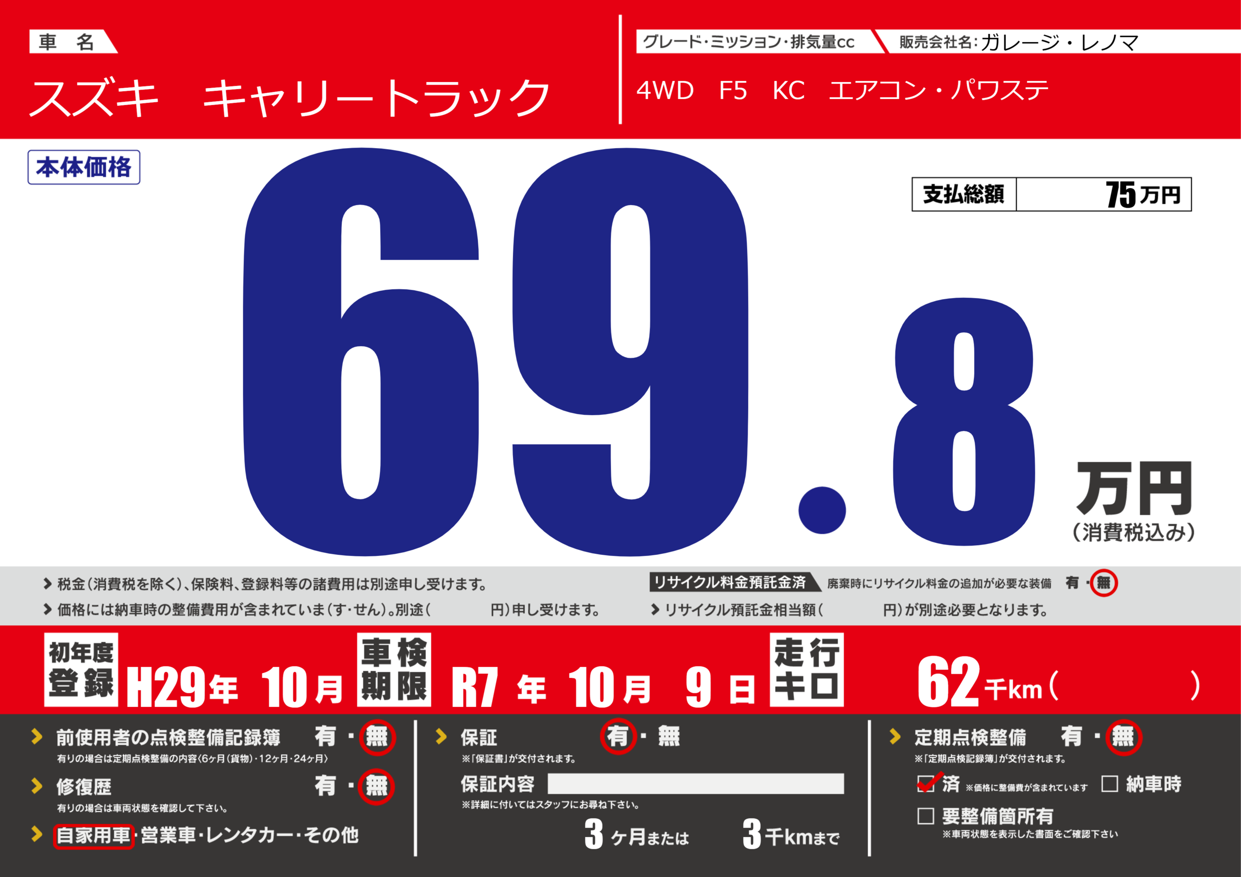 | 車名 | スズキ キャリートラック | グレード ミッション 排気量 |