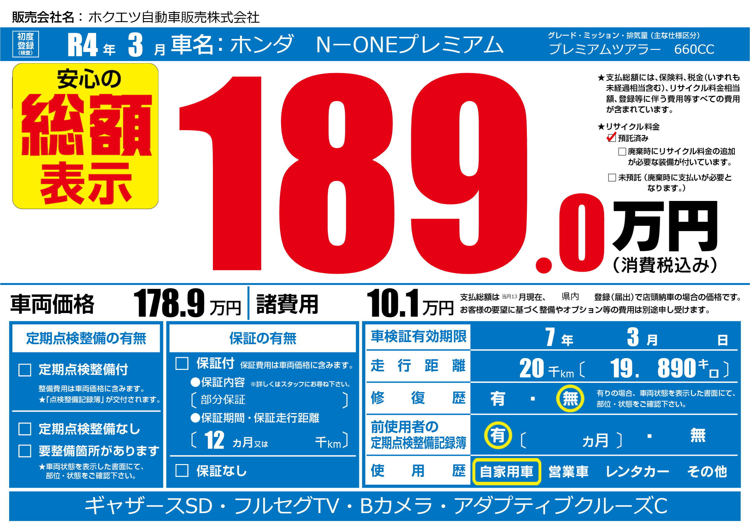 | 車名 | ホンダ NーONEプレミアム | グレード ミッション 排気量 |