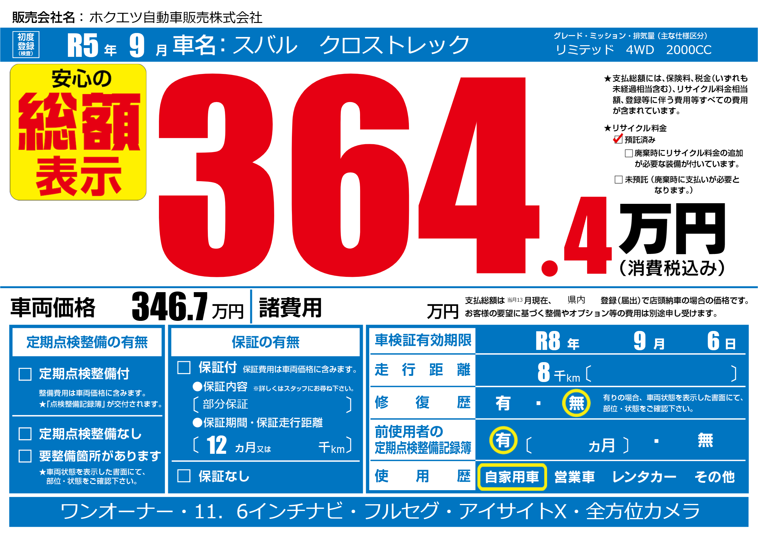 | 走行キロ | 0.8万km | 初年度登録 | R5年9月 |