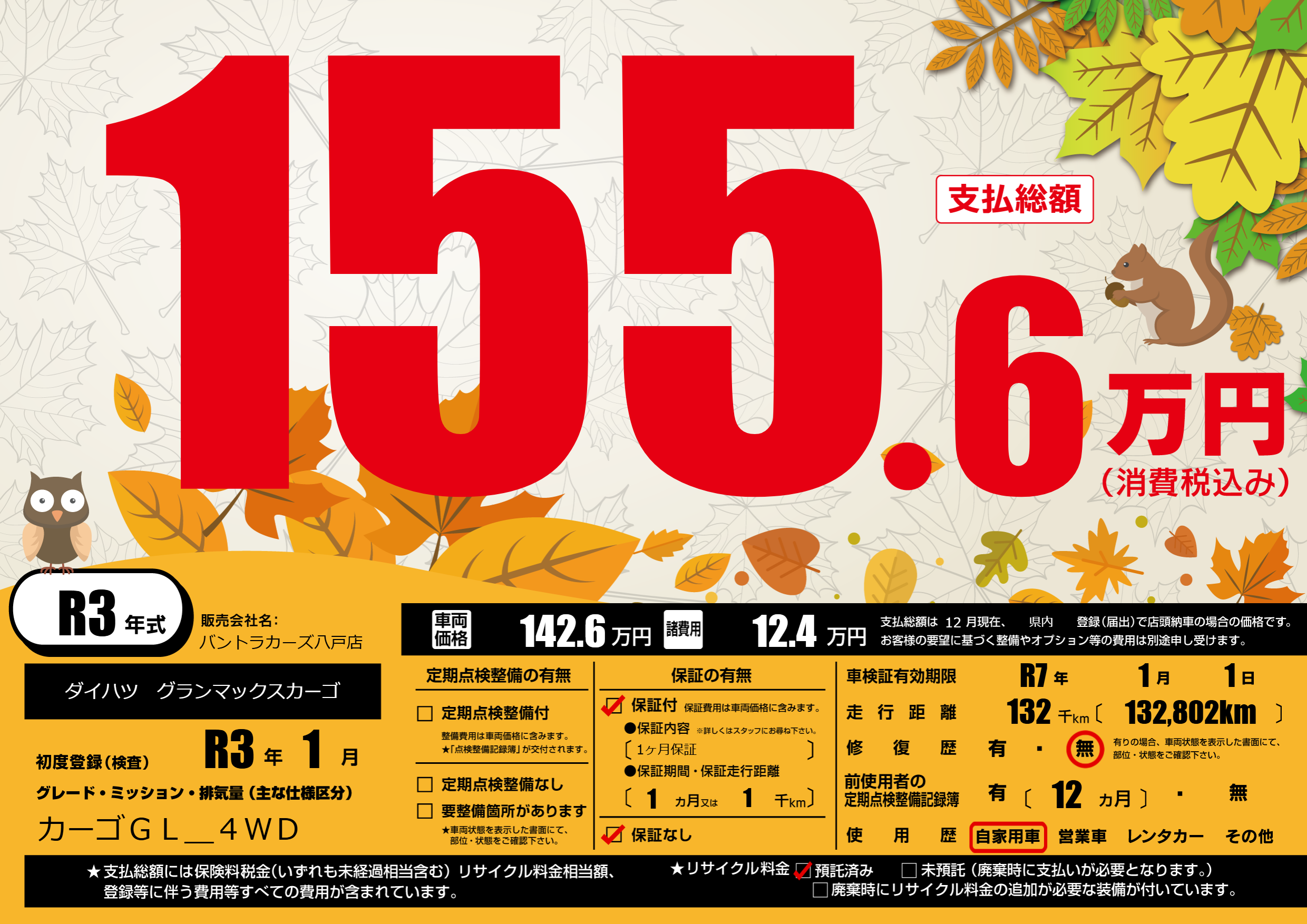 | 走行キロ | 13.2万km | 初年度登録 | R3年1月 |