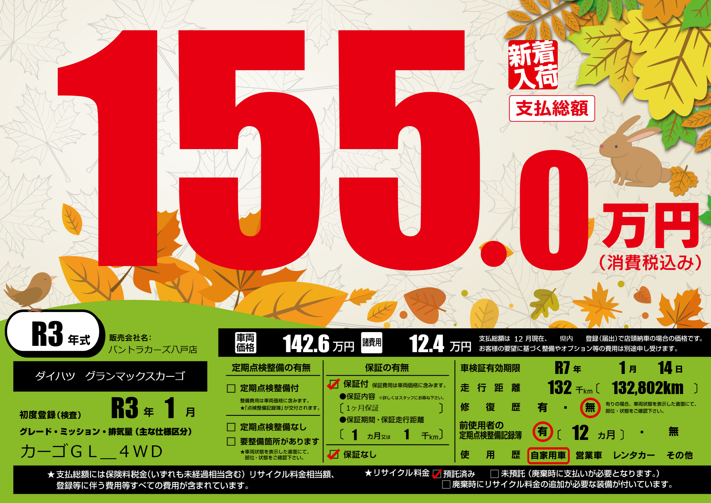| 走行キロ | 13.2万km | 初年度登録 | R3年1月 |