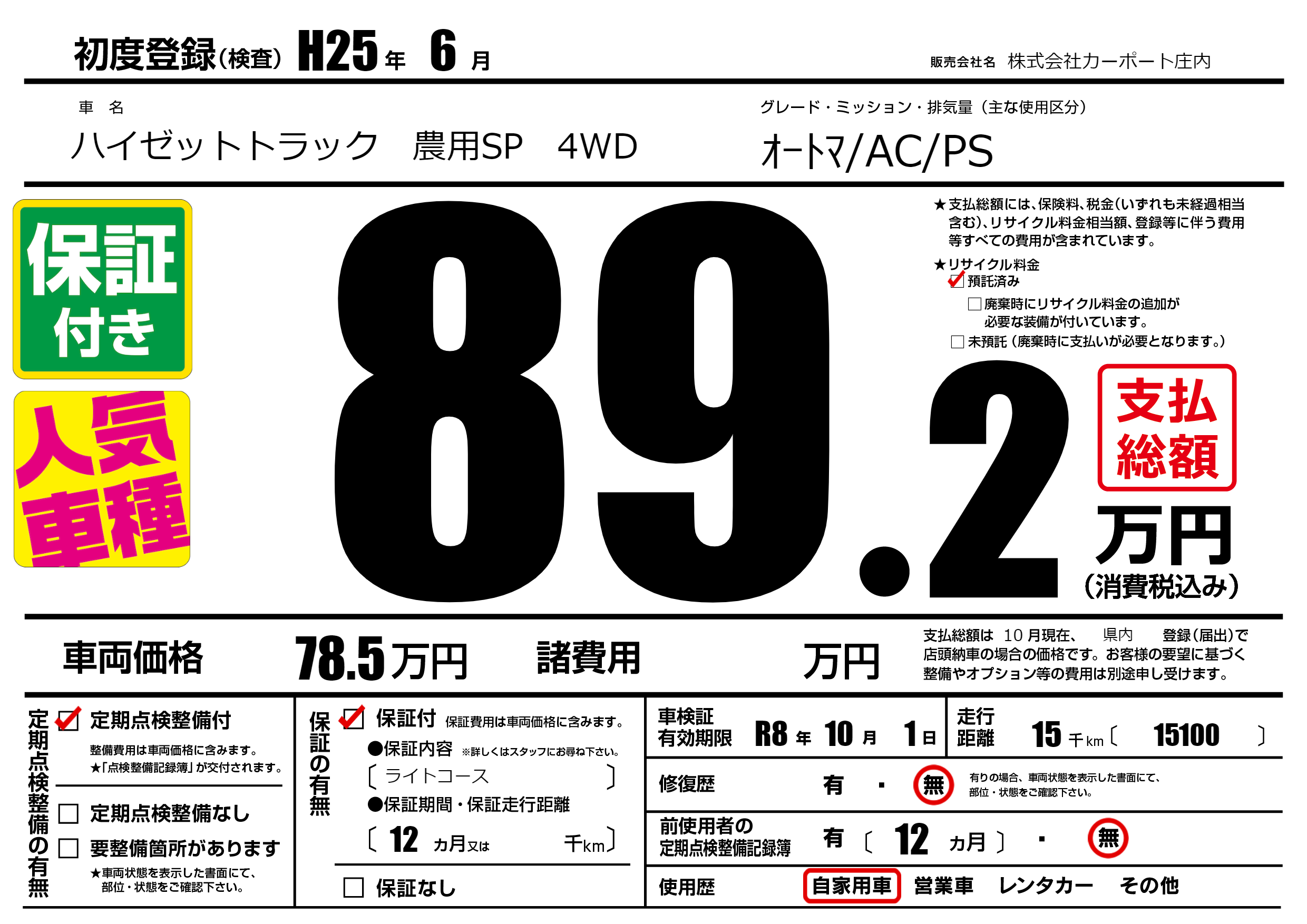| 車名 | ハイゼットトラック 農用SP 4WD | グレード ミッション 排気量 |
