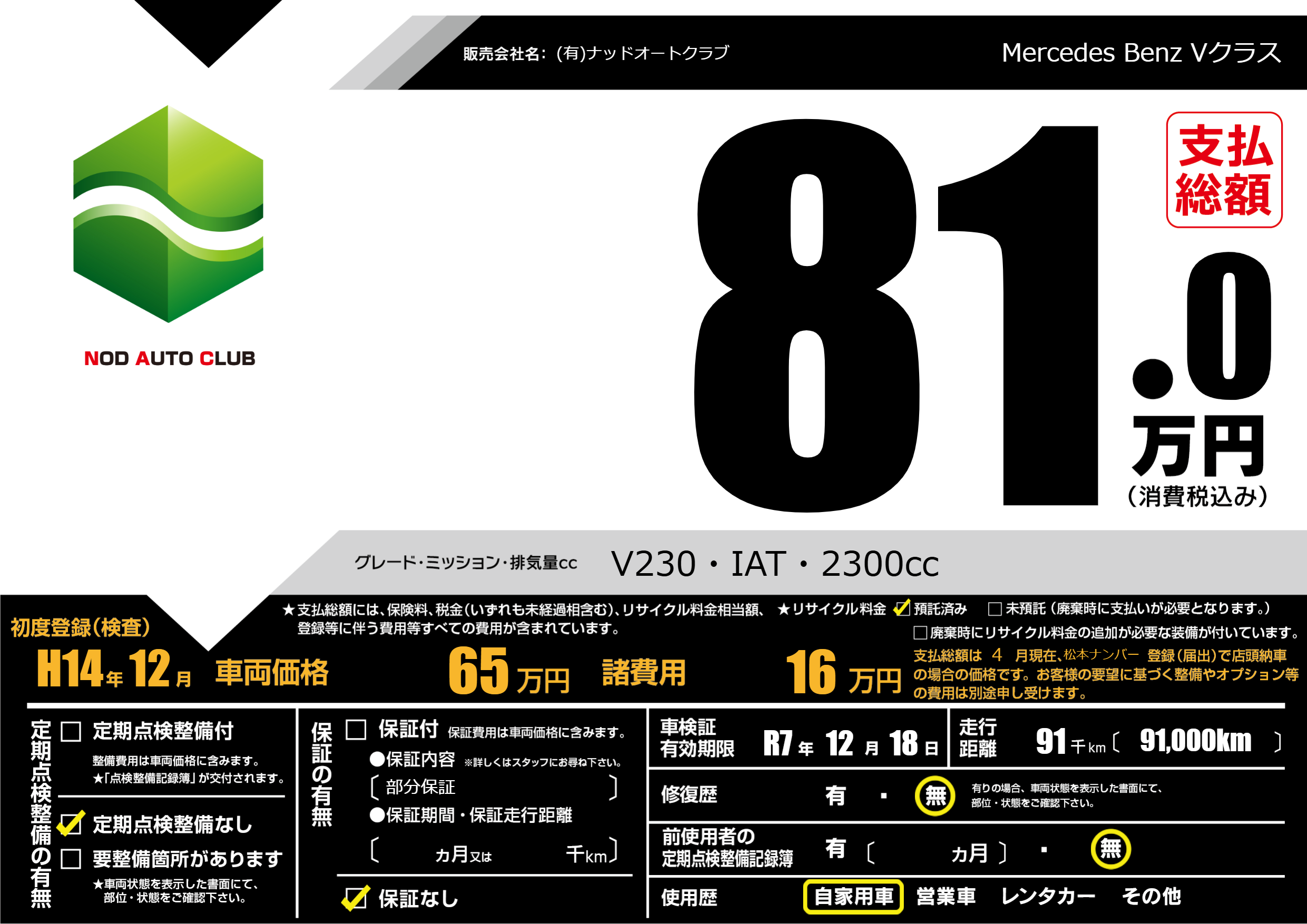 | 車名 | Mercedes Benz Vクラス | グレード ミッション 排気量 |