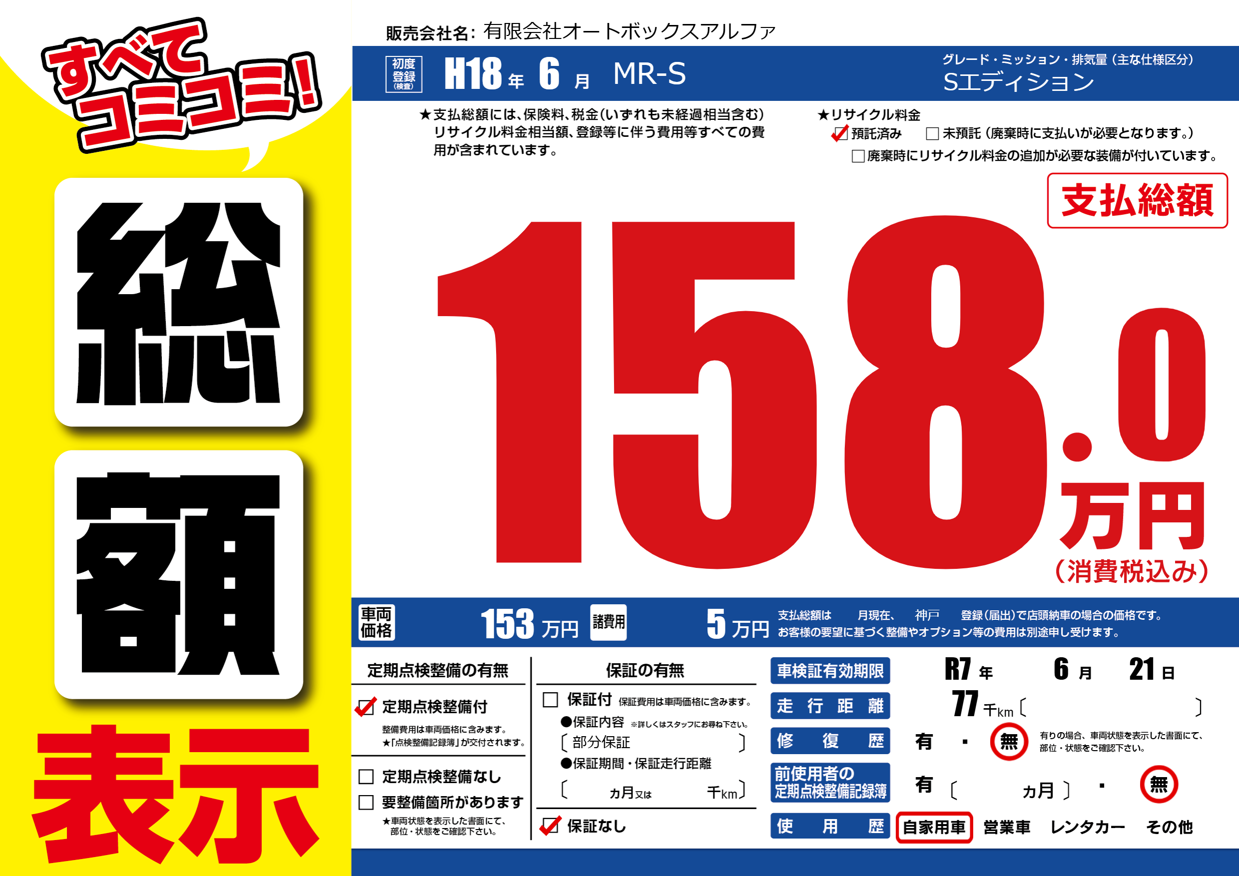 | 走行キロ | 7.7万km | 初年度登録 | H18年6月 |