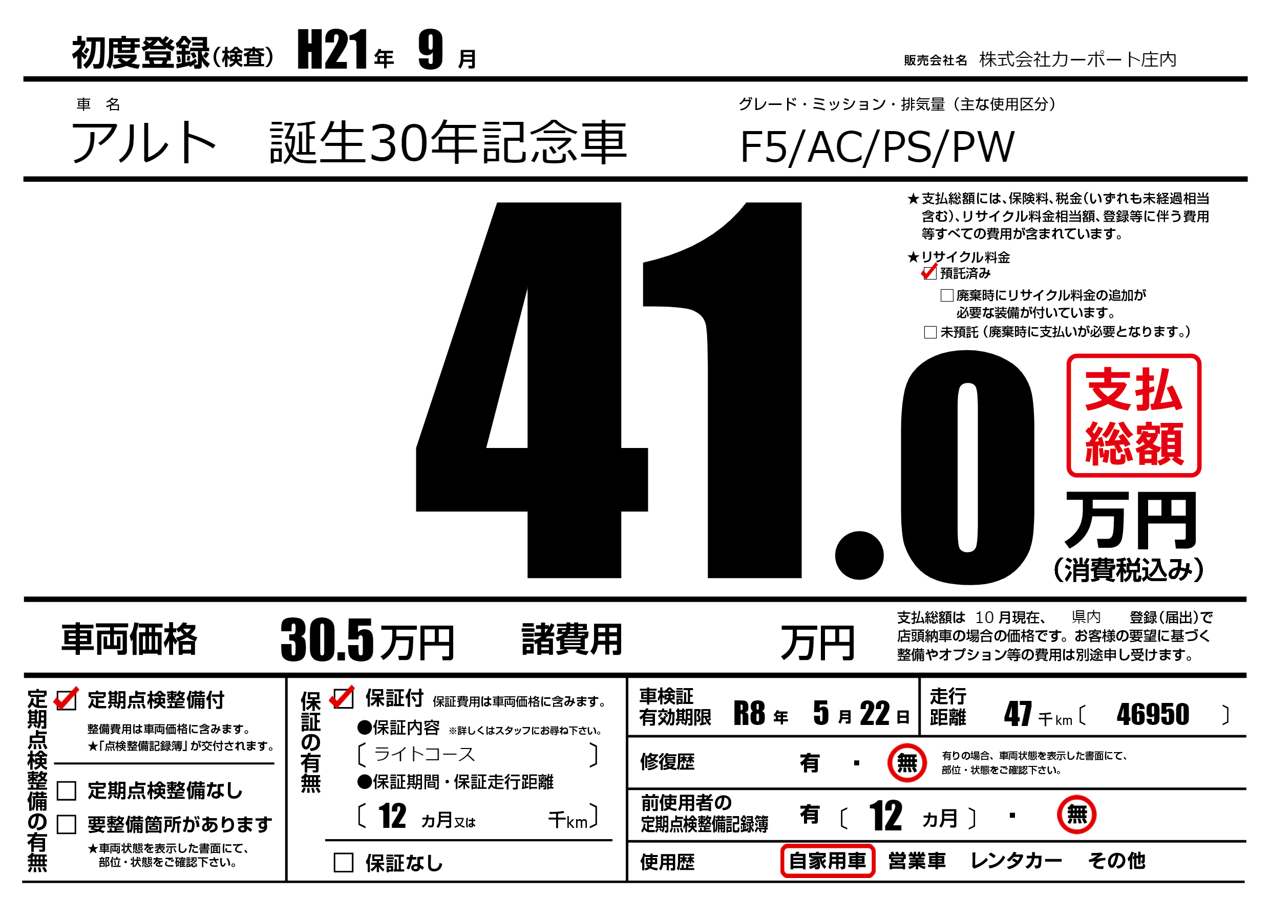 | 車名 | アルト 誕生30年記念車 | グレード ミッション 排気量 |