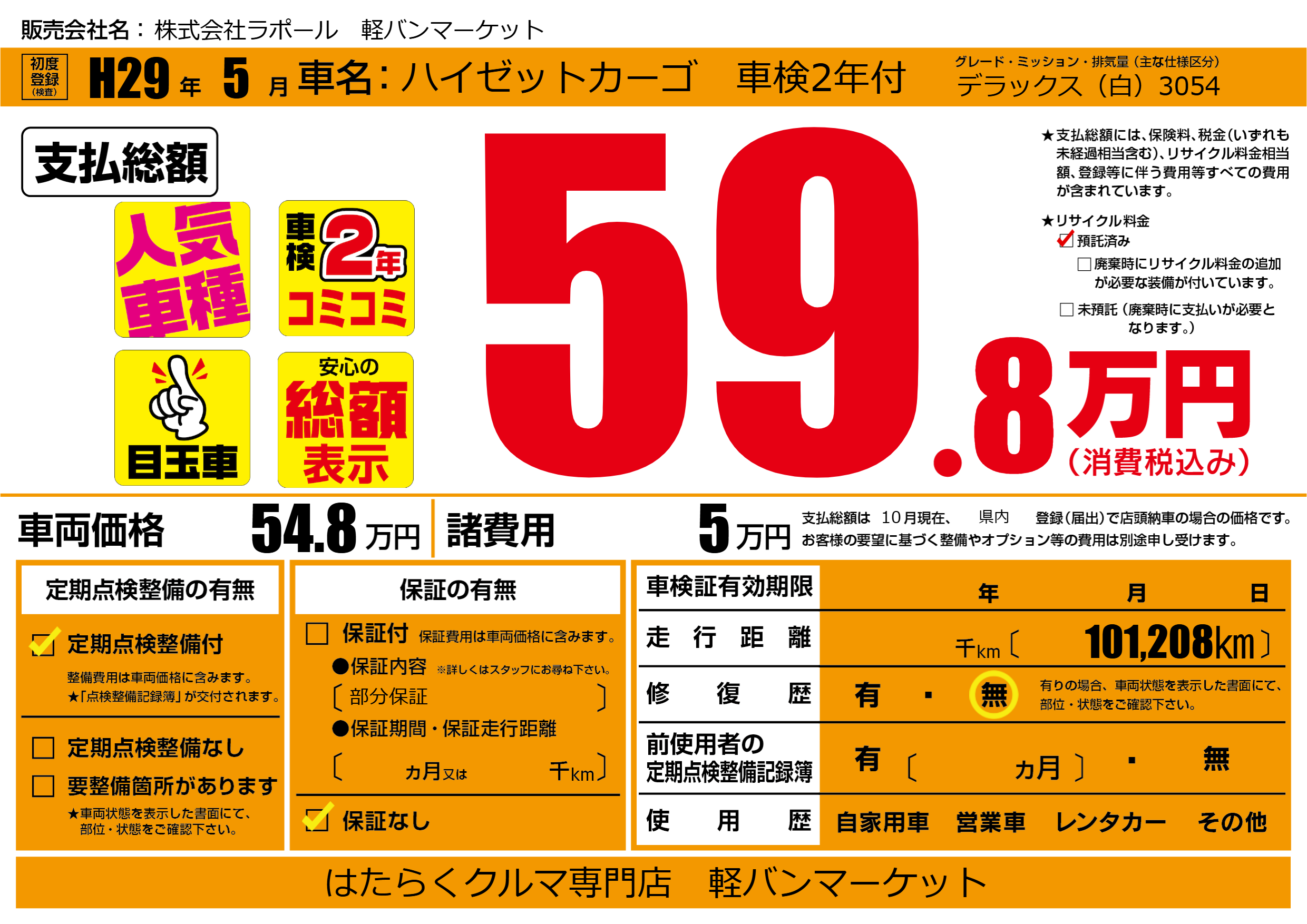 | 車名 | ハイゼットカーゴ 車検2年付 | グレード ミッション 排気量 |