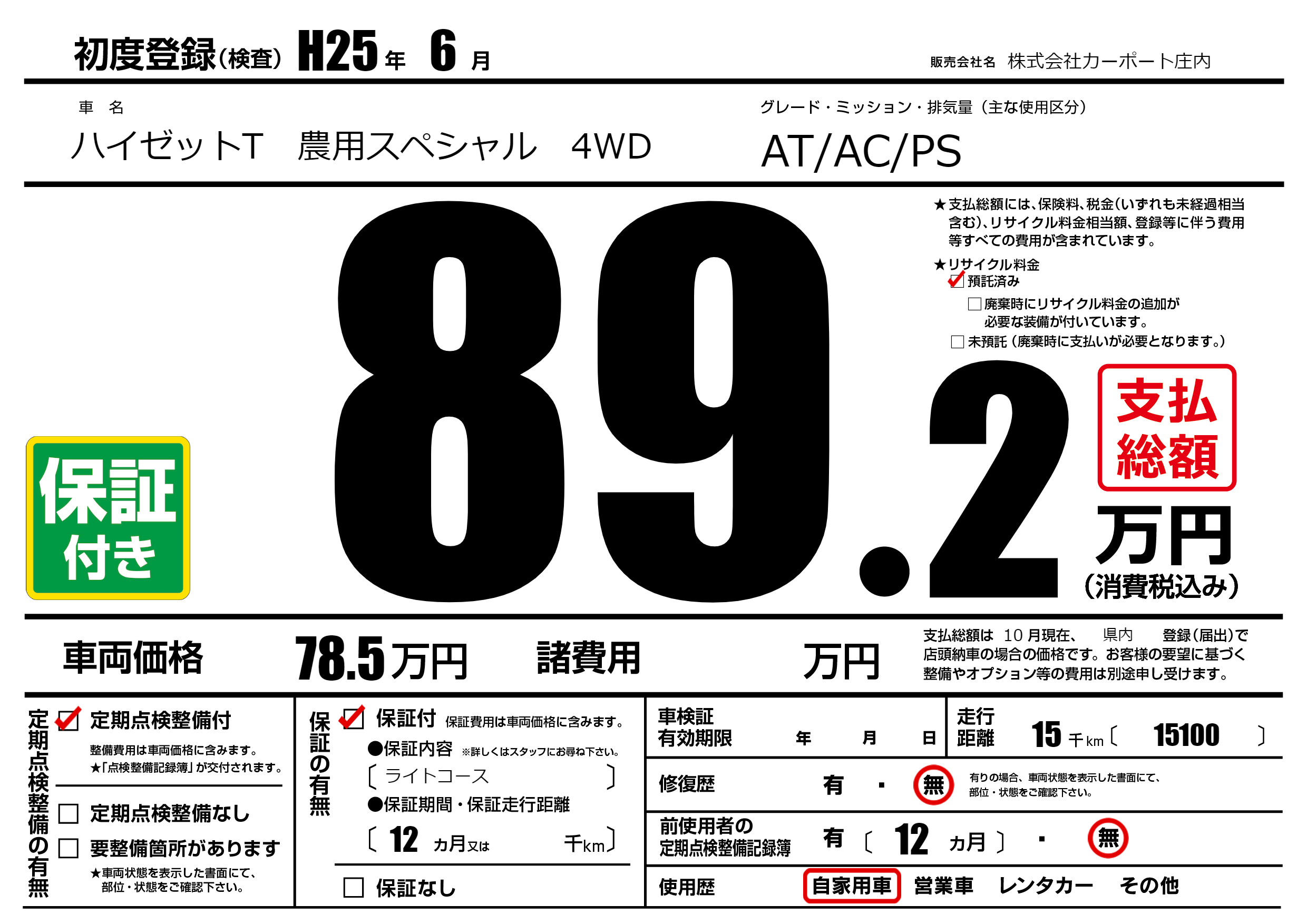 | 車名 | ハイゼットT 農用スペシャル 4WD | グレード ミッション 排気量 |