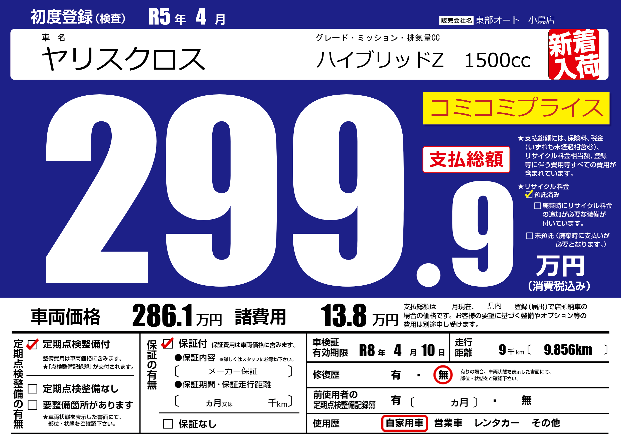 | 車名 | ヤリスクロス | グレード ミッション 排気量 |