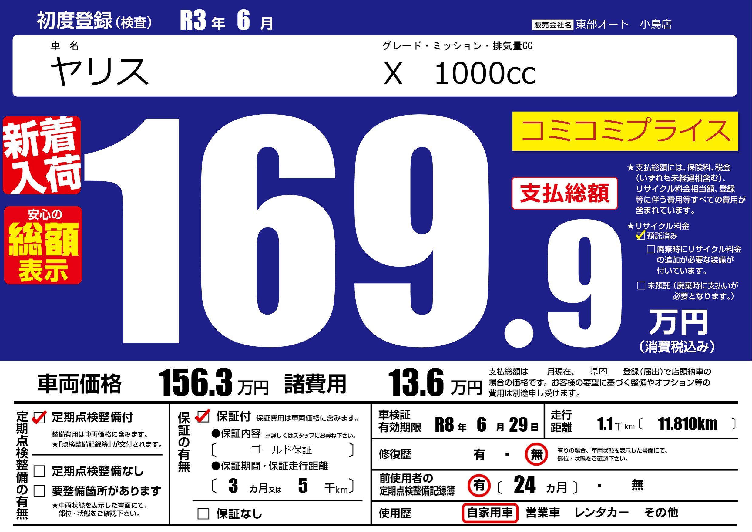 | 車名 | ヤリス | グレード ミッション 排気量 |