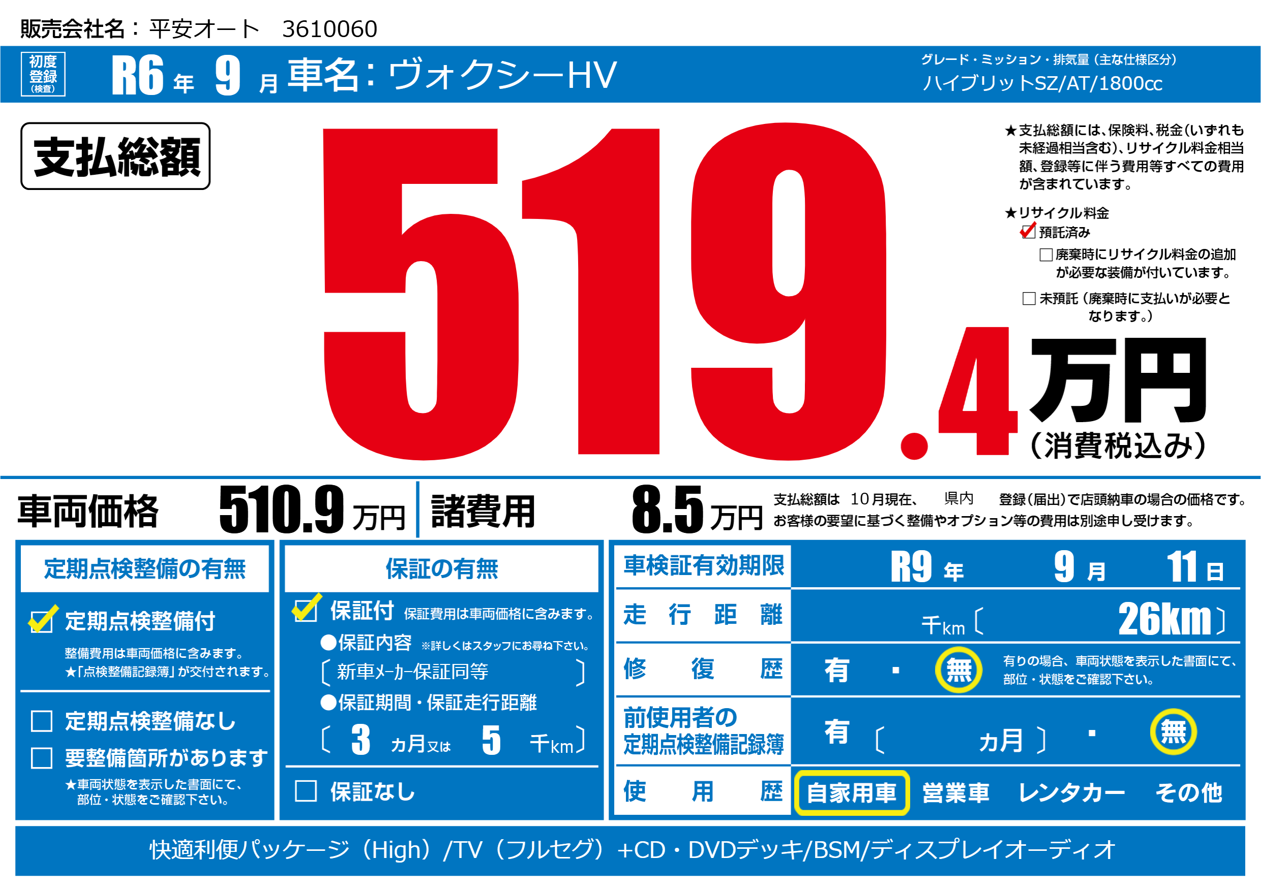 | 車名 | ヴォクシーHV | グレード ミッション 排気量 |