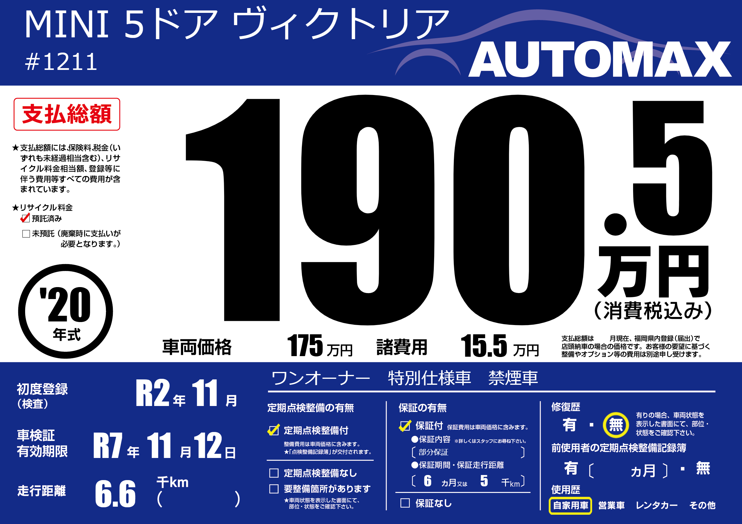 | 車名 | MINI 5ドア ヴィクトリア | グレード ミッション 排気量 |
