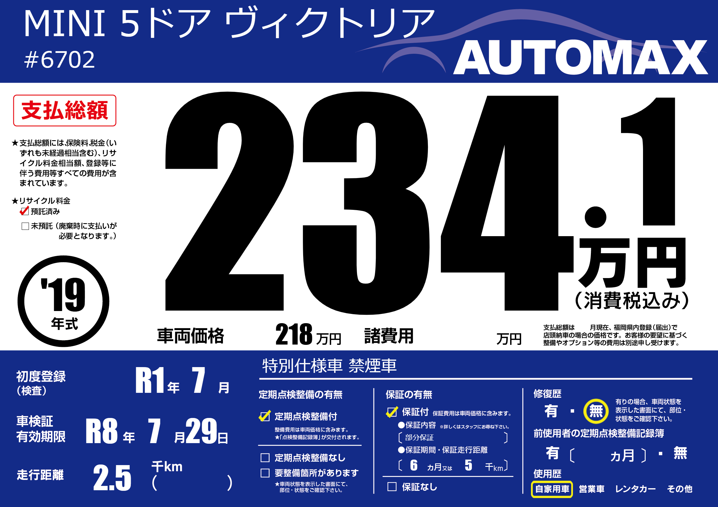 | 車検制限 | R8年 7月 29日 | ||
