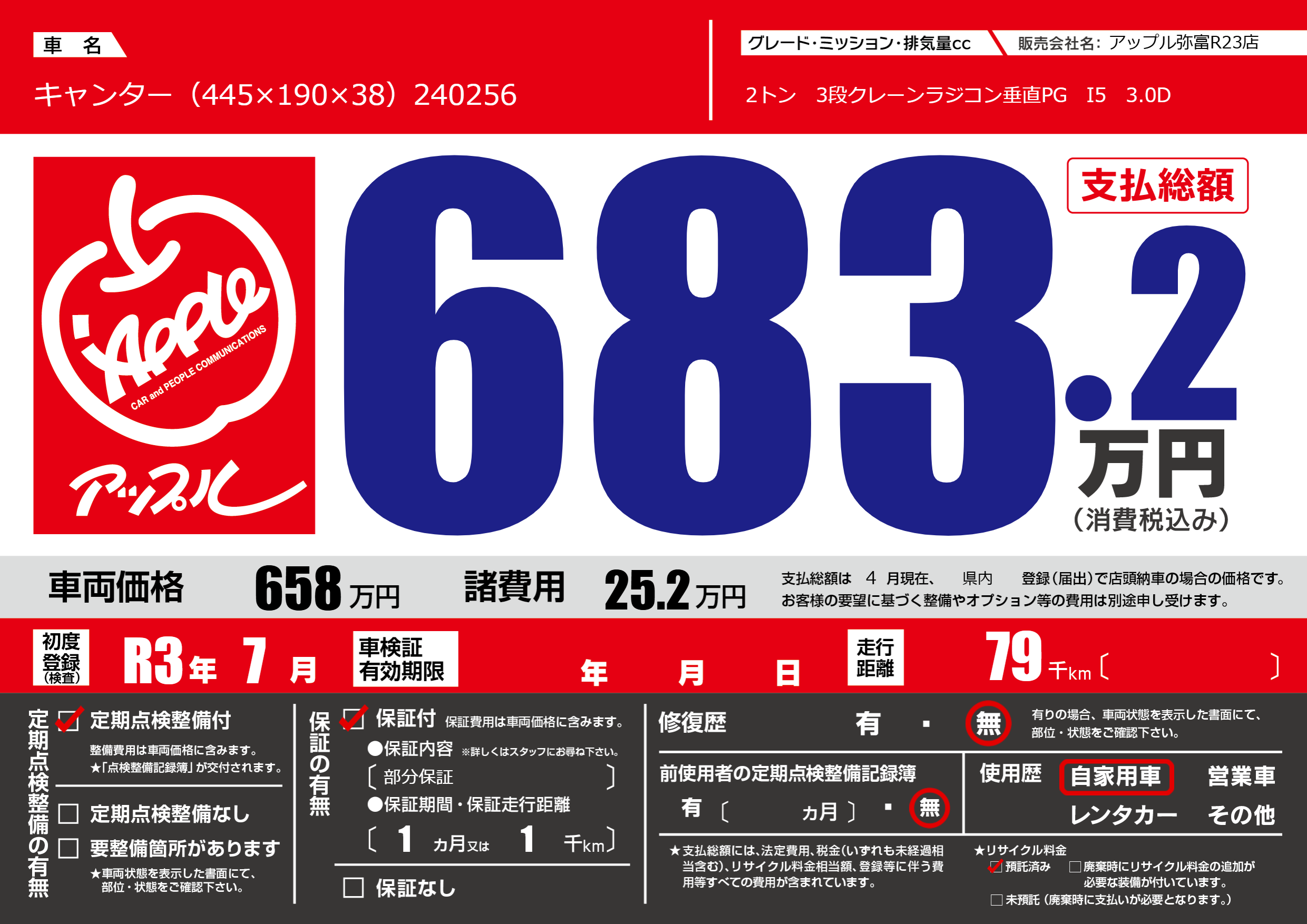 | 車名 | キャンター(445×190×38)240256 | グレード ミッション 排気量 |