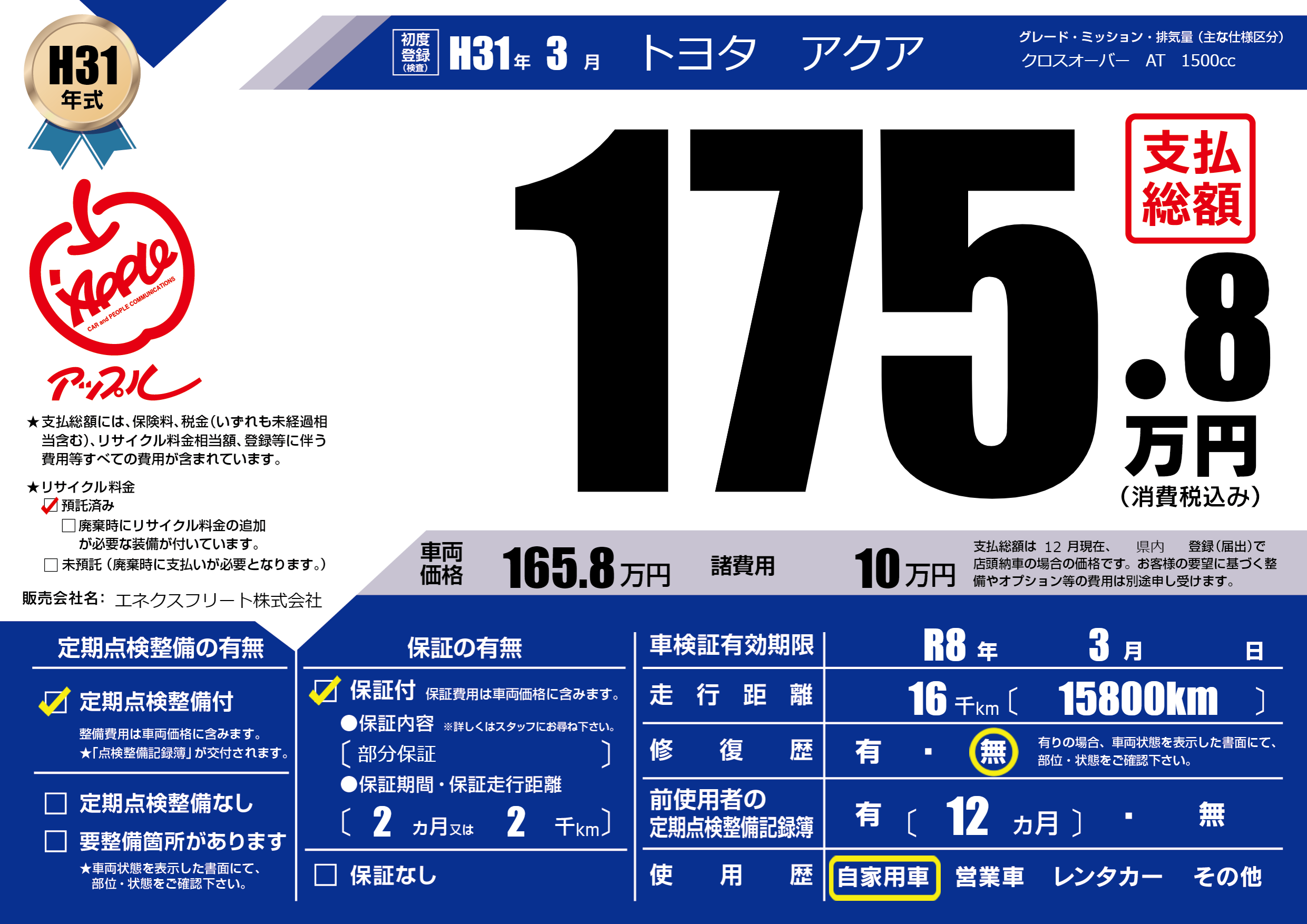| 車検制限 | R8年 3月 - 日 | ||