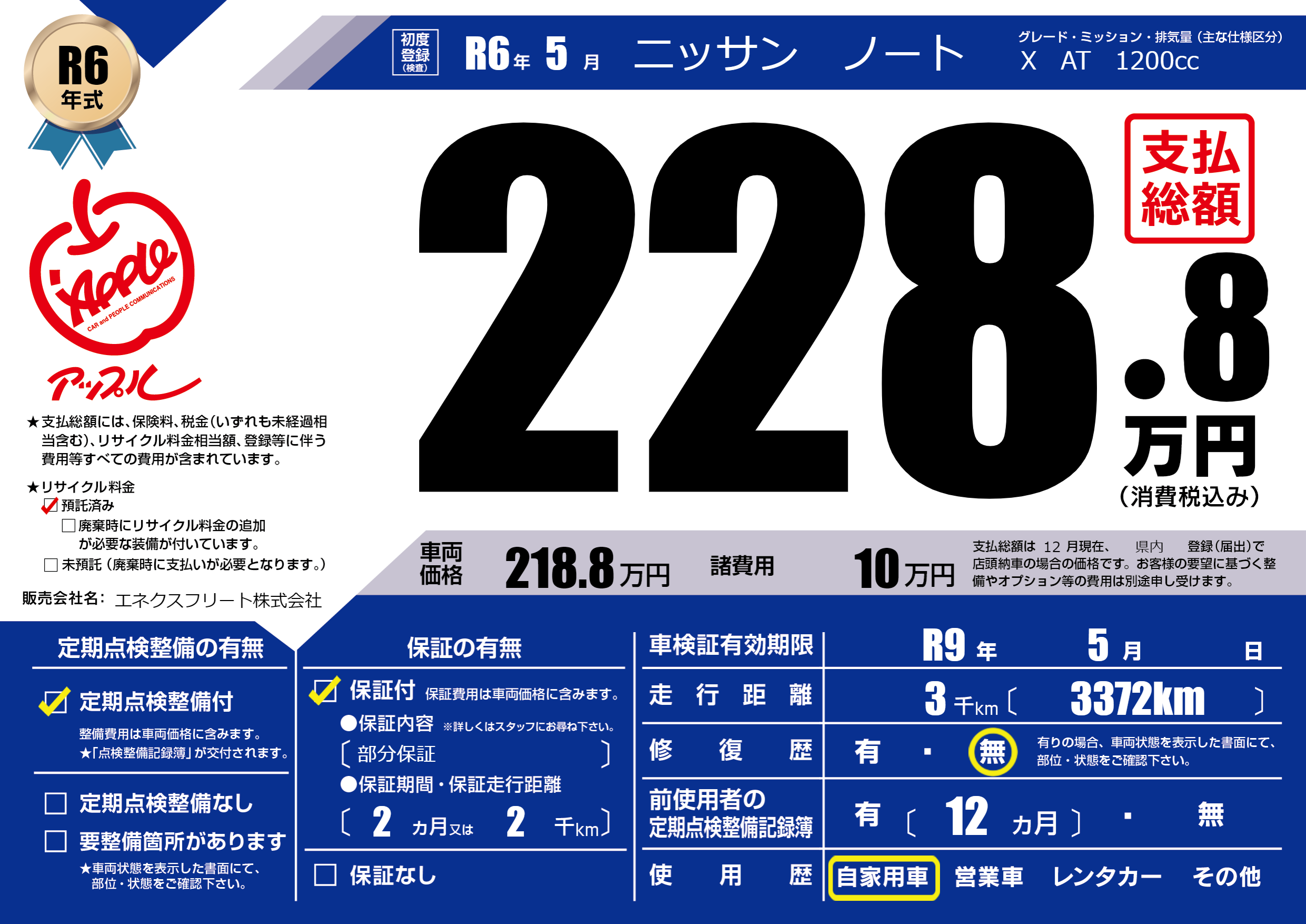 | 走行キロ | 0.3万km | 初年度登録 | R6年5月 |