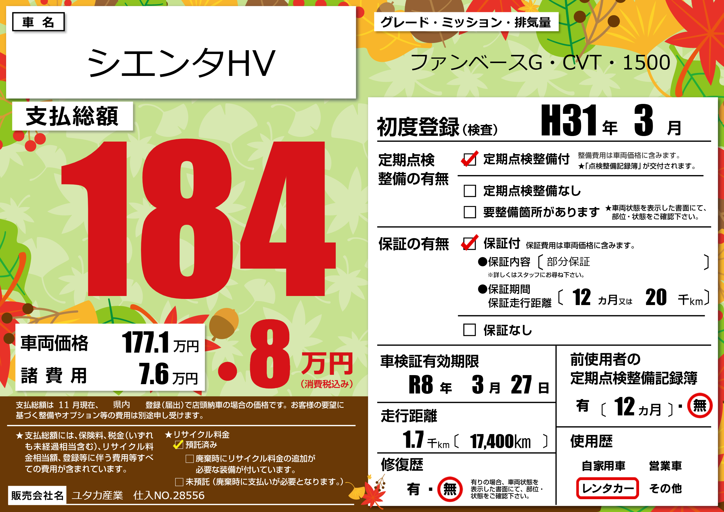 | 車名 | シエンタHV | グレード ミッション 排気量 |