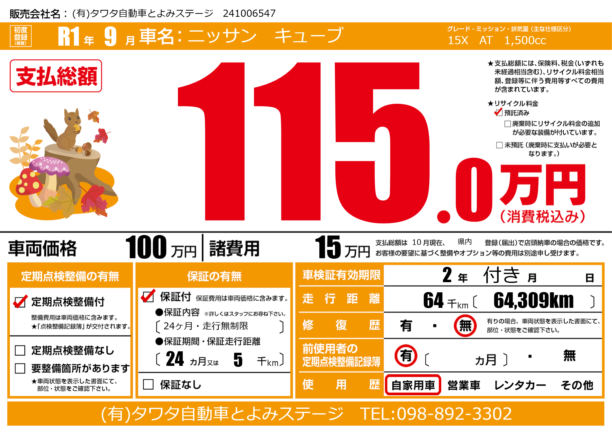 | 車名 | ニッサン キューブ | グレード ミッション 排気量 |