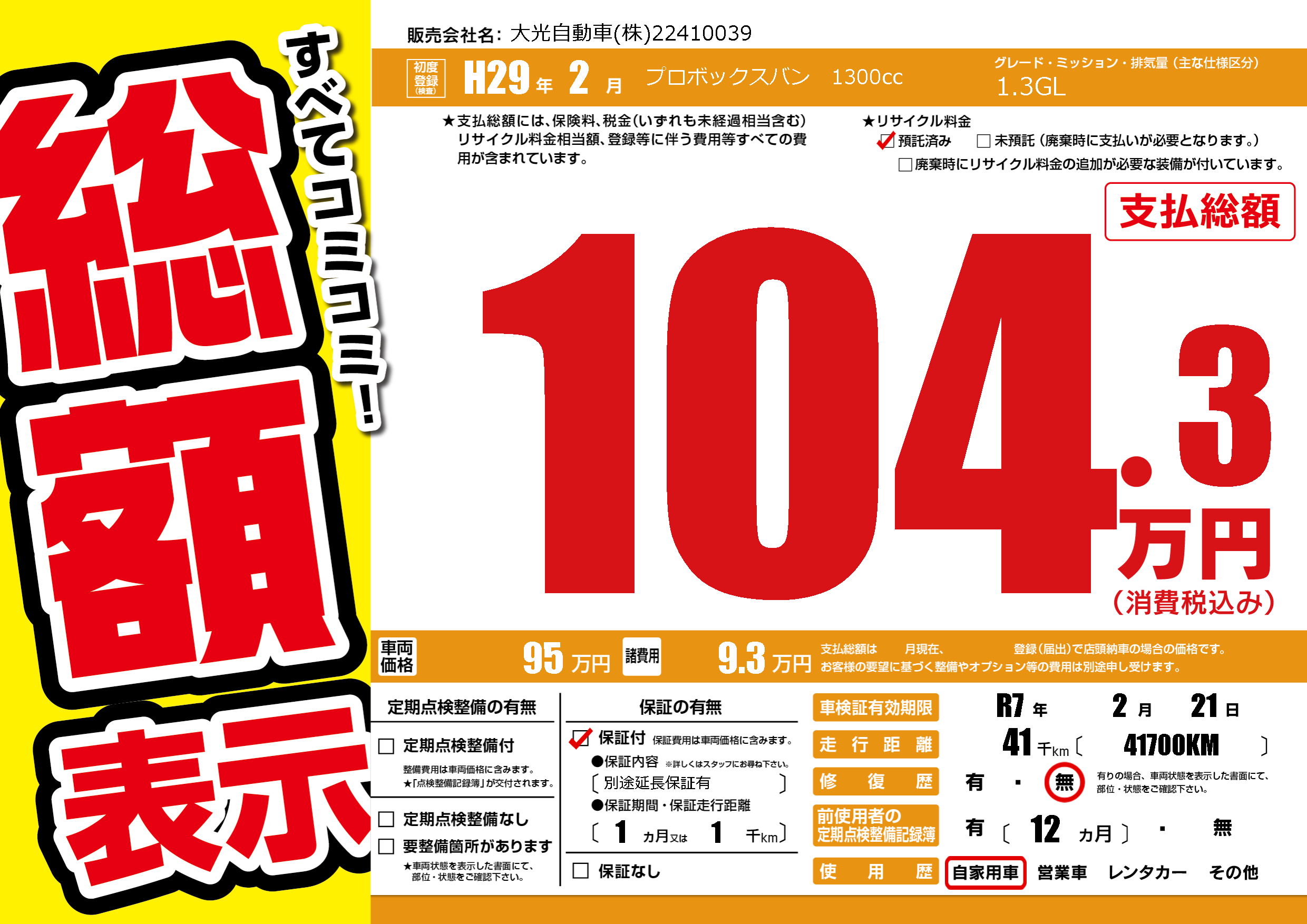 | 車名 | プロボックスバン 1300cc | グレード ミッション 排気量 |