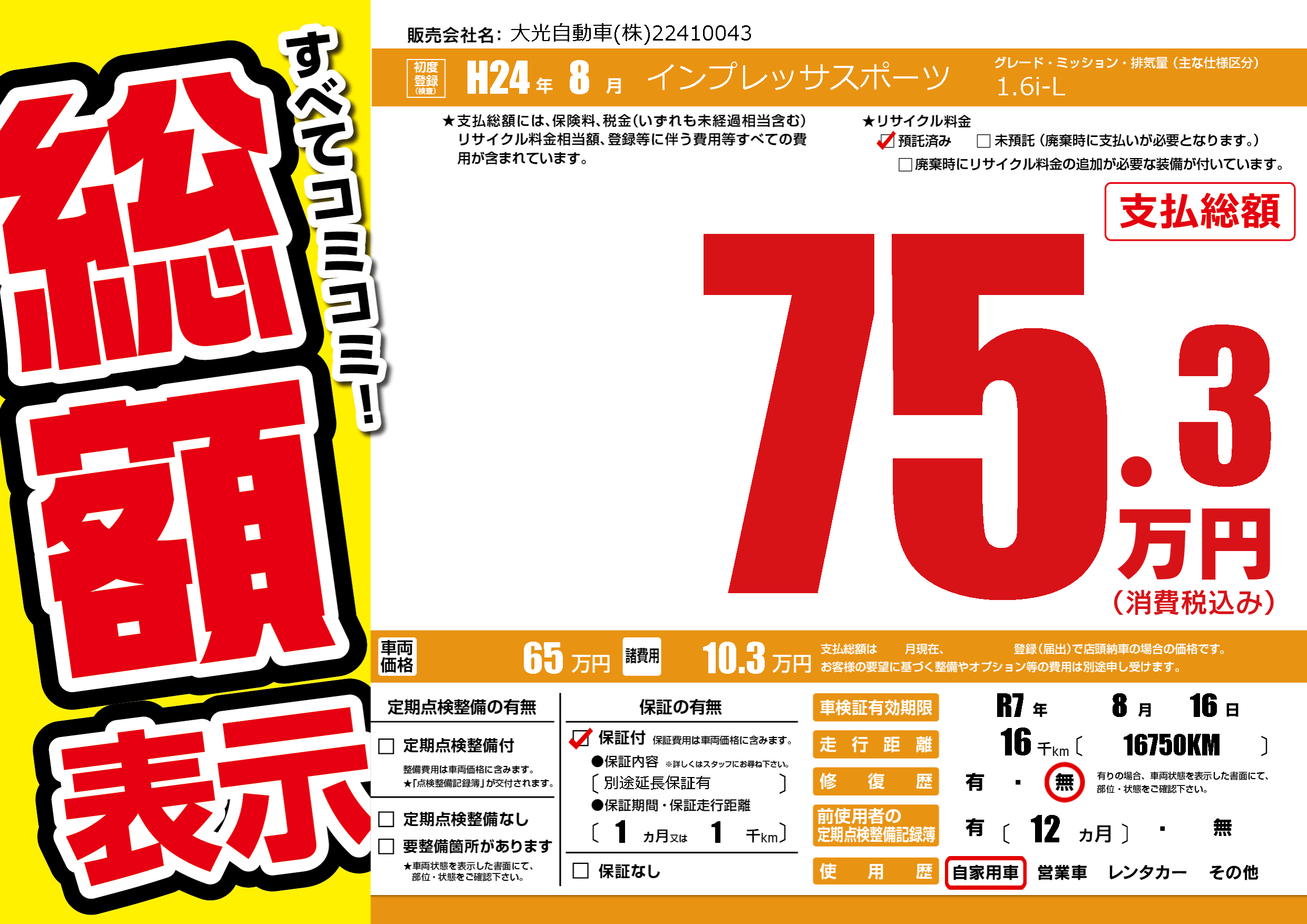 | 車名 | インプレッサスポーツ | グレード ミッション 排気量 |
