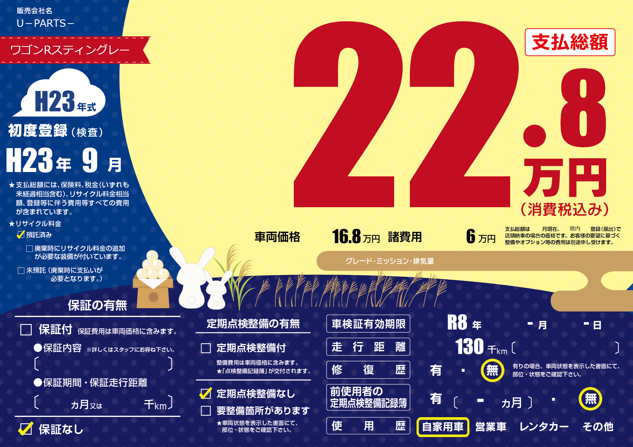 | 走行キロ | 13万km | 初年度登録 | H23年9月 |