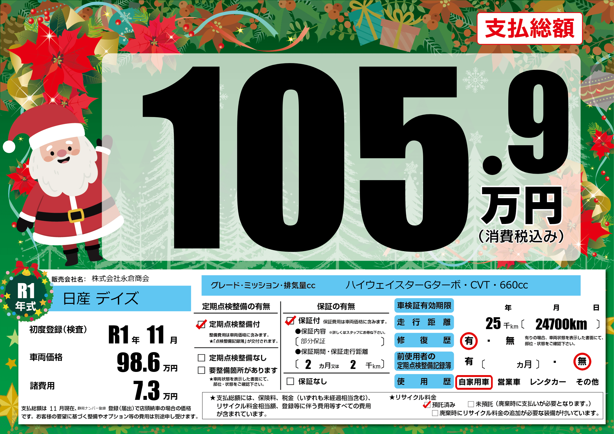 | 車名 | 日産 デイズ | グレード ミッション 排気量 |