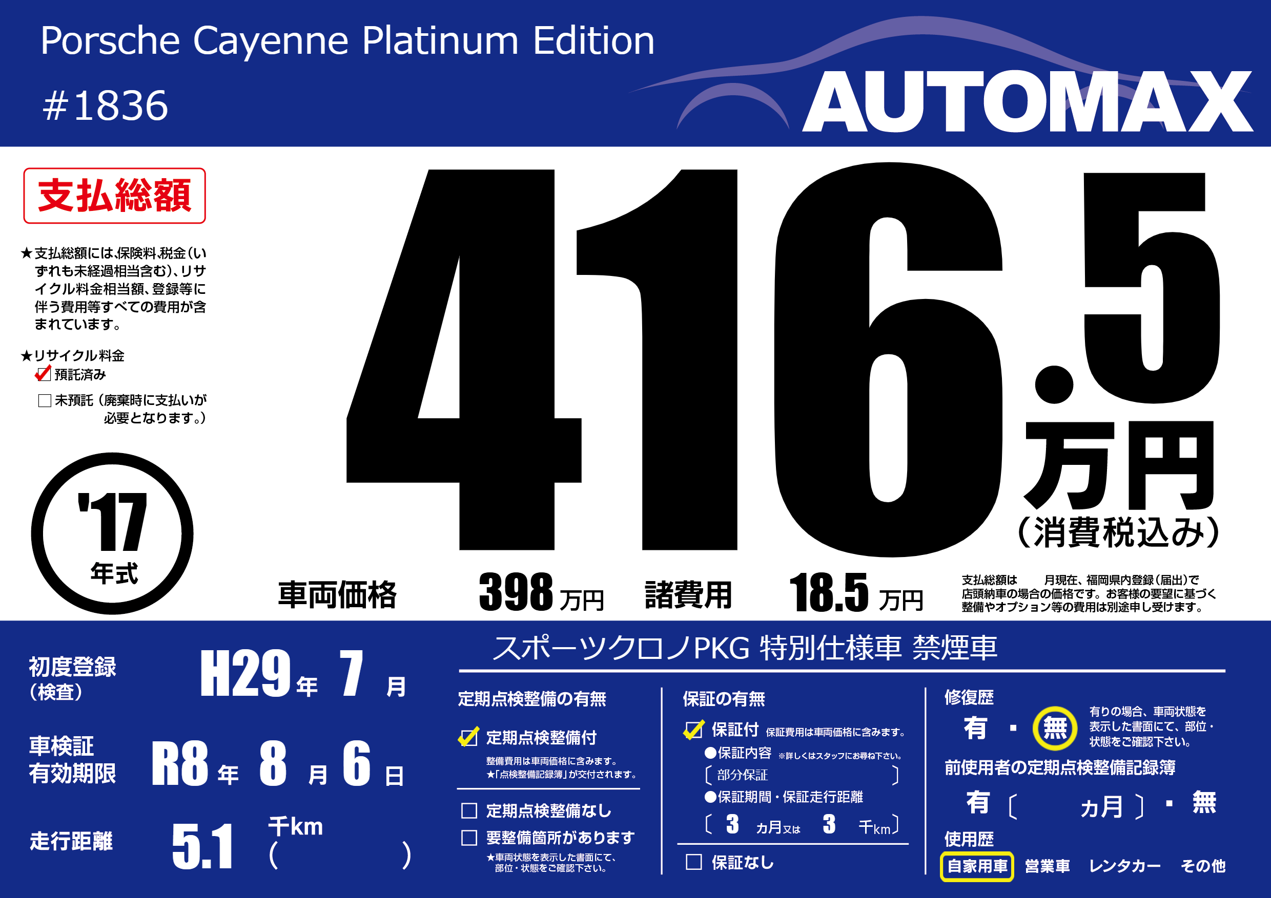 | 車名 | Porsche Cayenne Platinum Edition | グレード ミッション 排気量 |