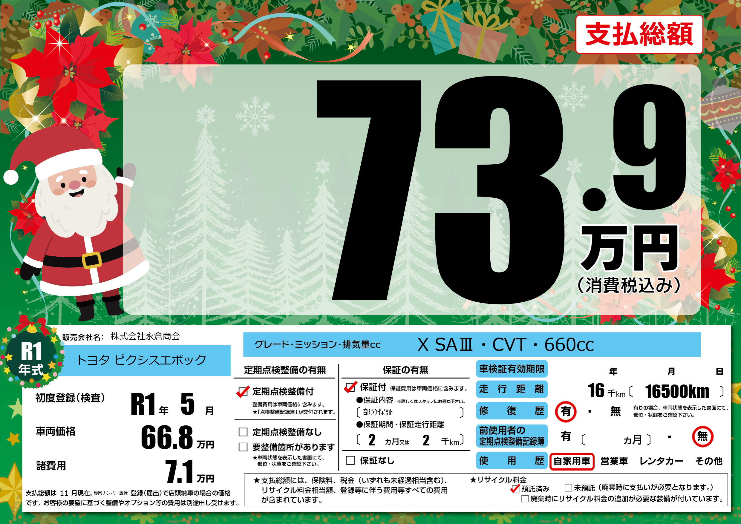 | 車名 | トヨタ ピクシスエポック | グレード ミッション 排気量 |