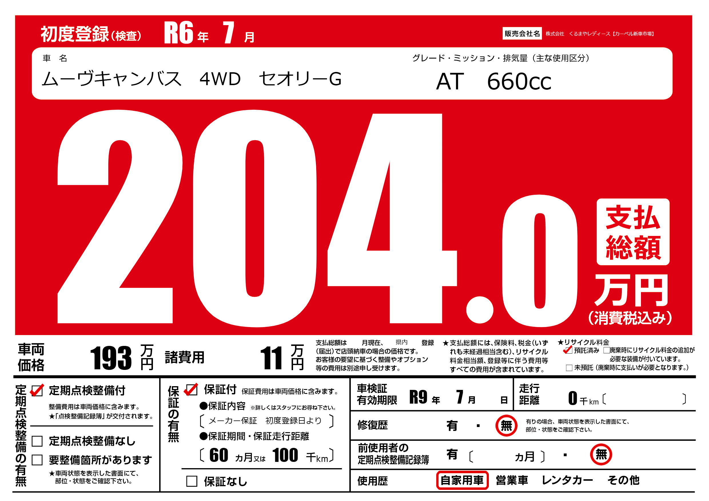 | 車名 | ムーヴキャンバス 4WD セオリーG | グレード ミッション 排気量 |